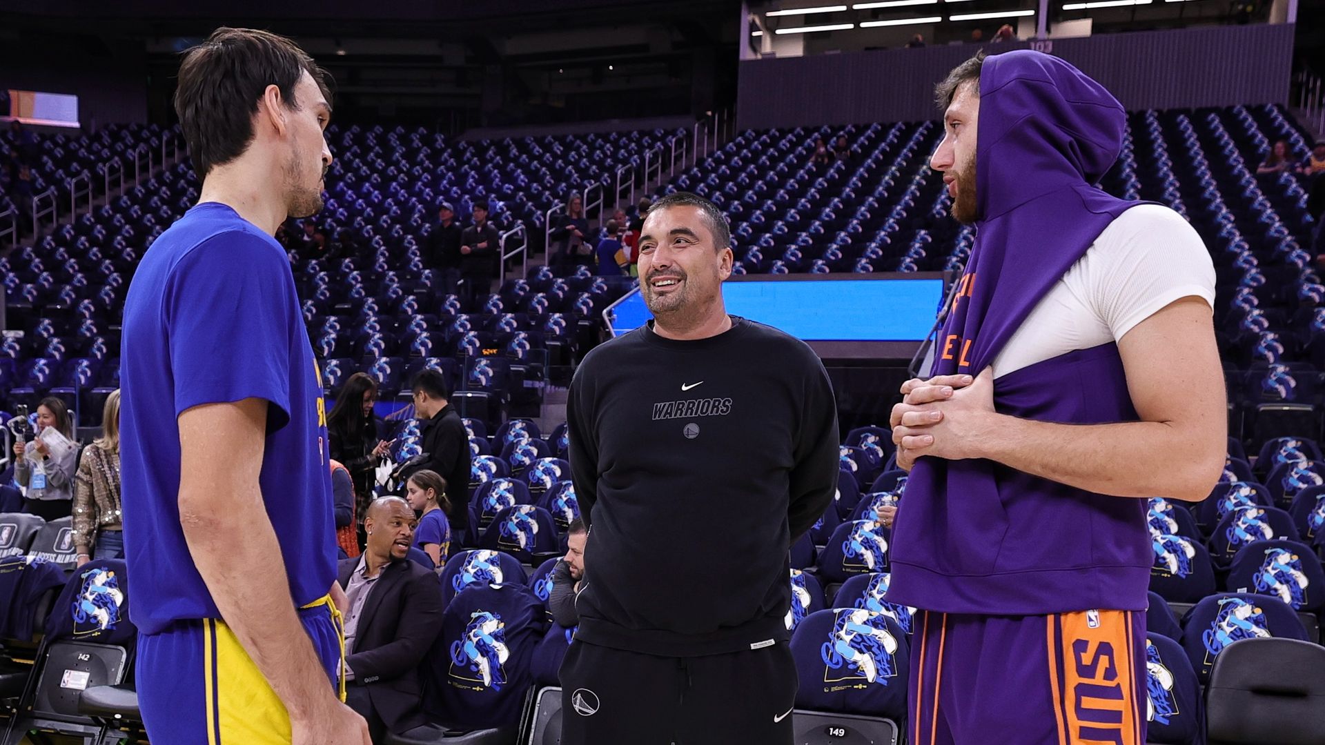 Warriors player Dario Šarić and assistant coach Dejan Milojević chat with Phoenix Suns player Jusuf Nurkic on opening day in October 2023. Photo: Jim Poorten/NBAE via Getty Images