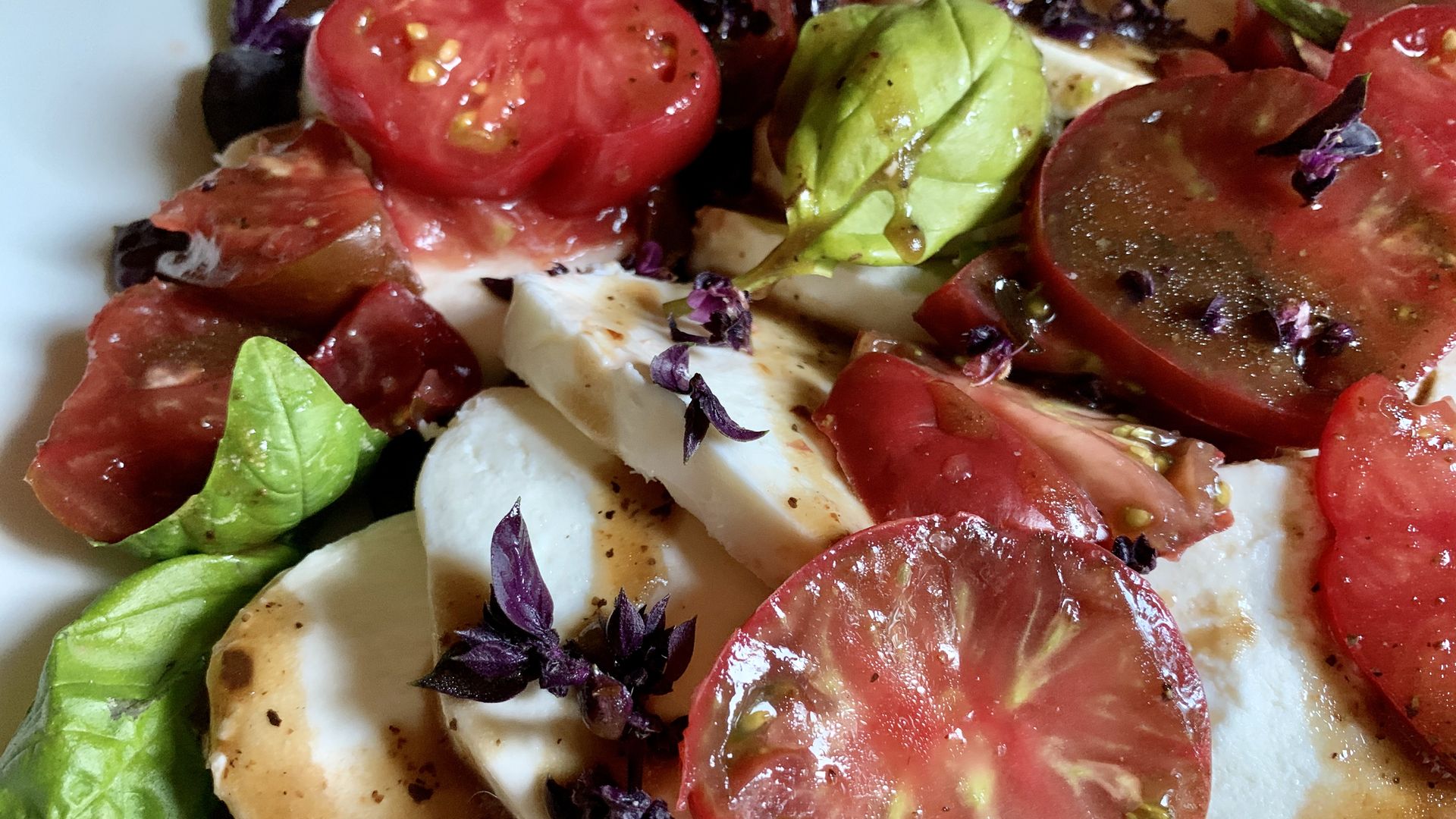 Purple flowers from a basil plant add color and zing to a caprese salad. Photo courtesy of Erica Browne Grivas