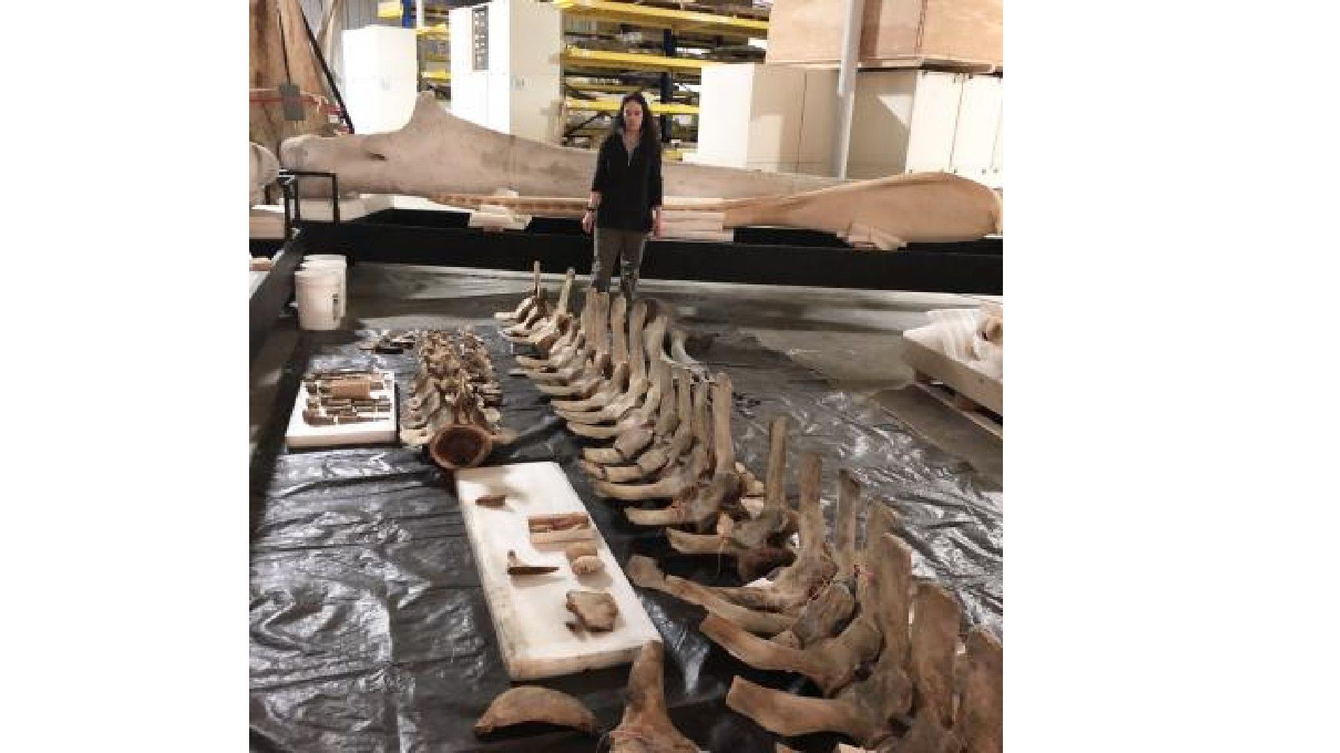 NOAA's Patricia Rosel examines Rice's whale type specimen at the Smithsonian’s National Museum of Natural History. Credit: NOAA