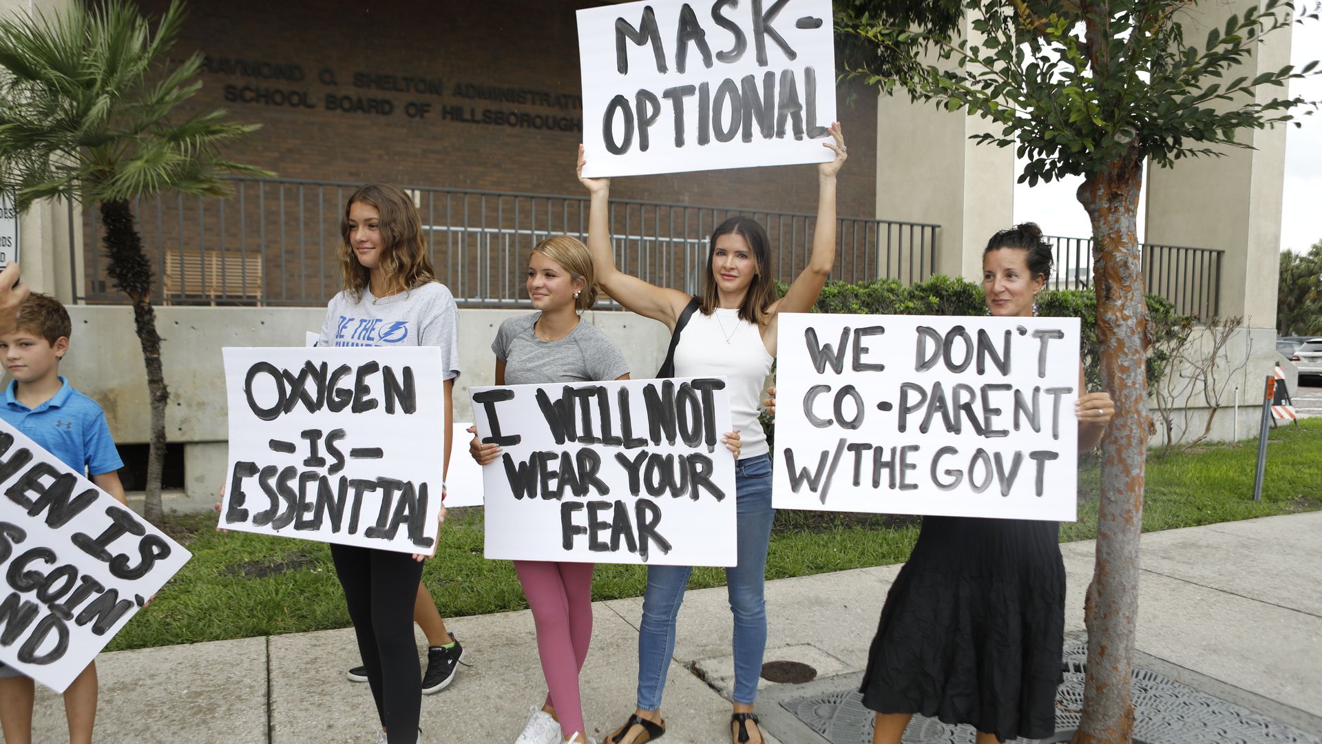 Families protest masks outside the Hillsborough County school board meeting. Photo: Octavio Jones/Getty Images