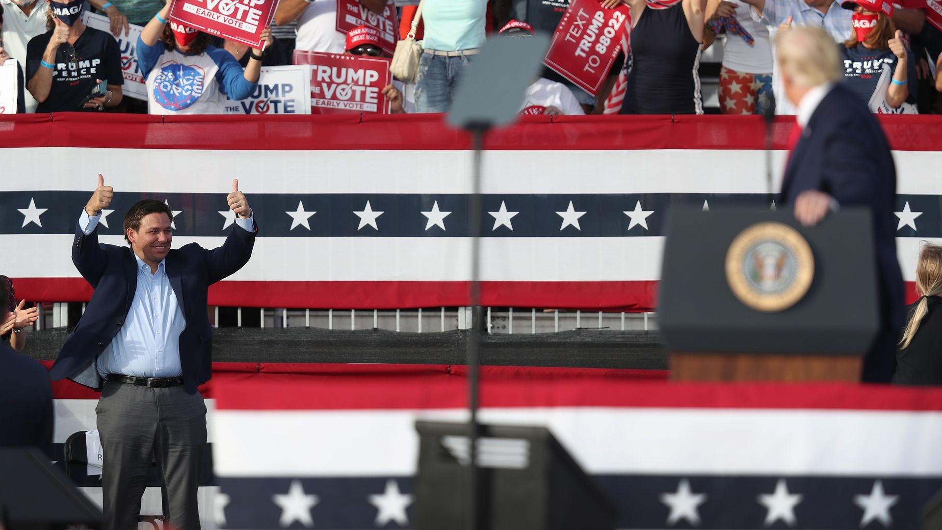 Gov. Ron DeSantis gives two thumbs up toward former President Trump at The Villages Polo Club in October. Photo: Joe Raedle/Getty Images