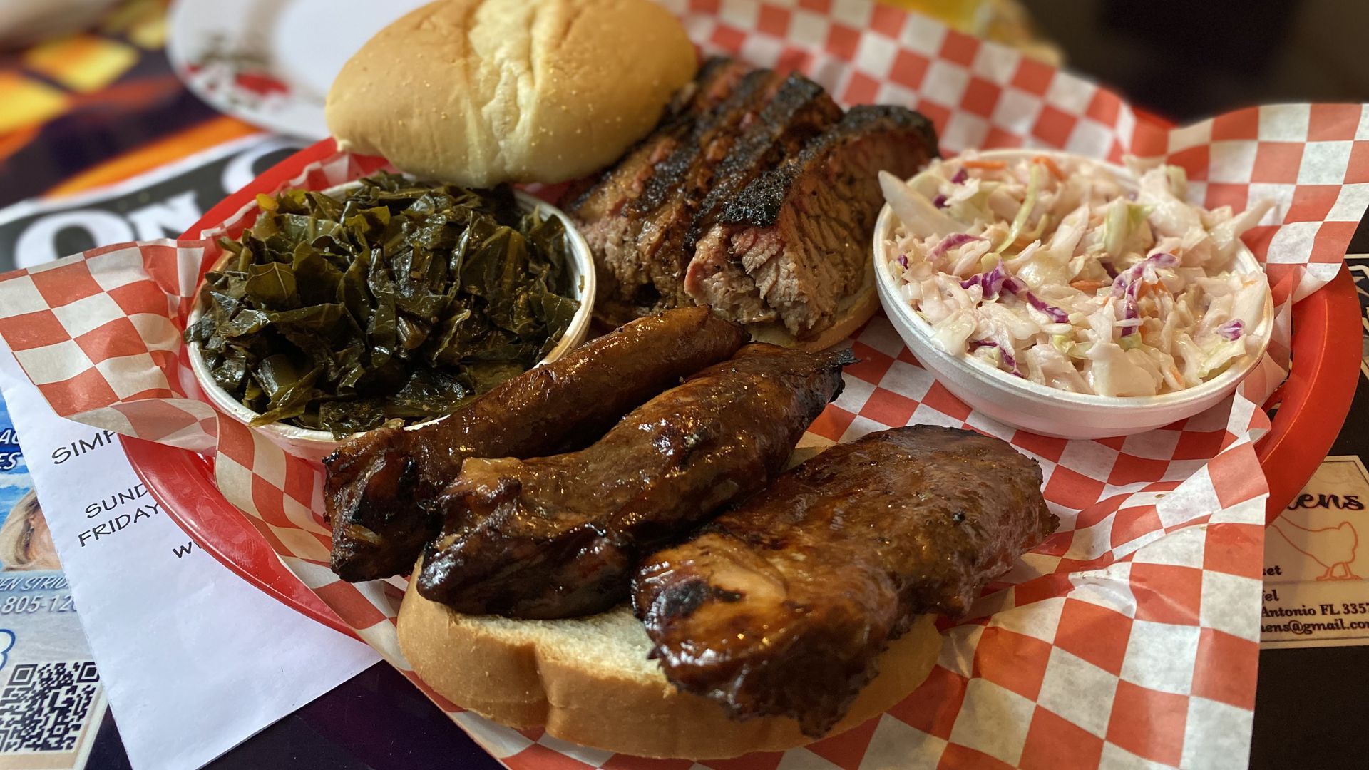 Clockwise from left: greens, beef brisket, slaw and ... turkey ribs at On Q Smokehouse Grill in San Antonio. Photo: Ben Montgomery/Axios