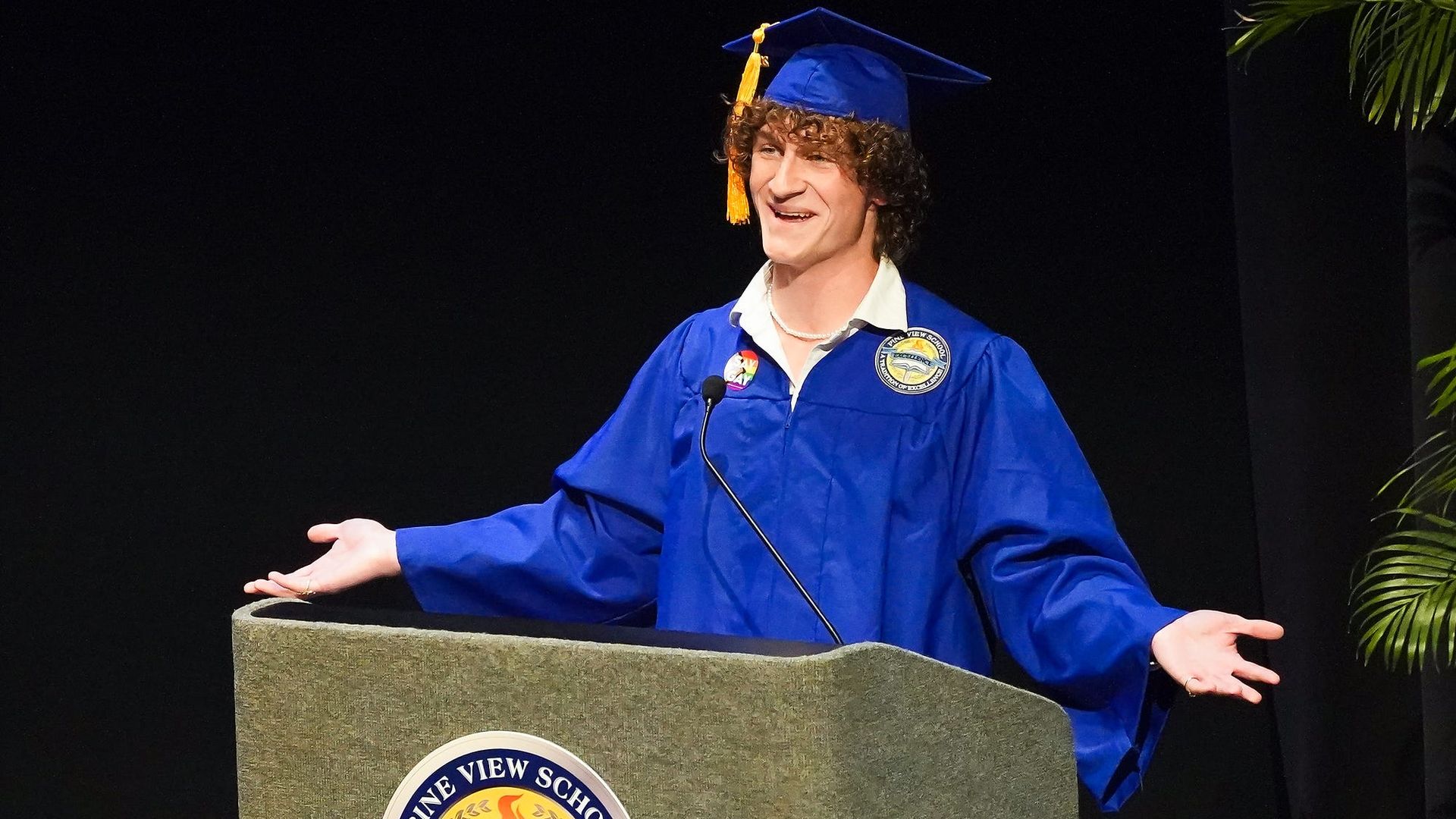 Pine View School graduate and class president Zander Moricz delivers his commencement speech at the Van Wezel Performing Arts Hall in Sarasota on Sunday. Photo: Dan Wagner/Herald-Tribune/USA TODAY Network