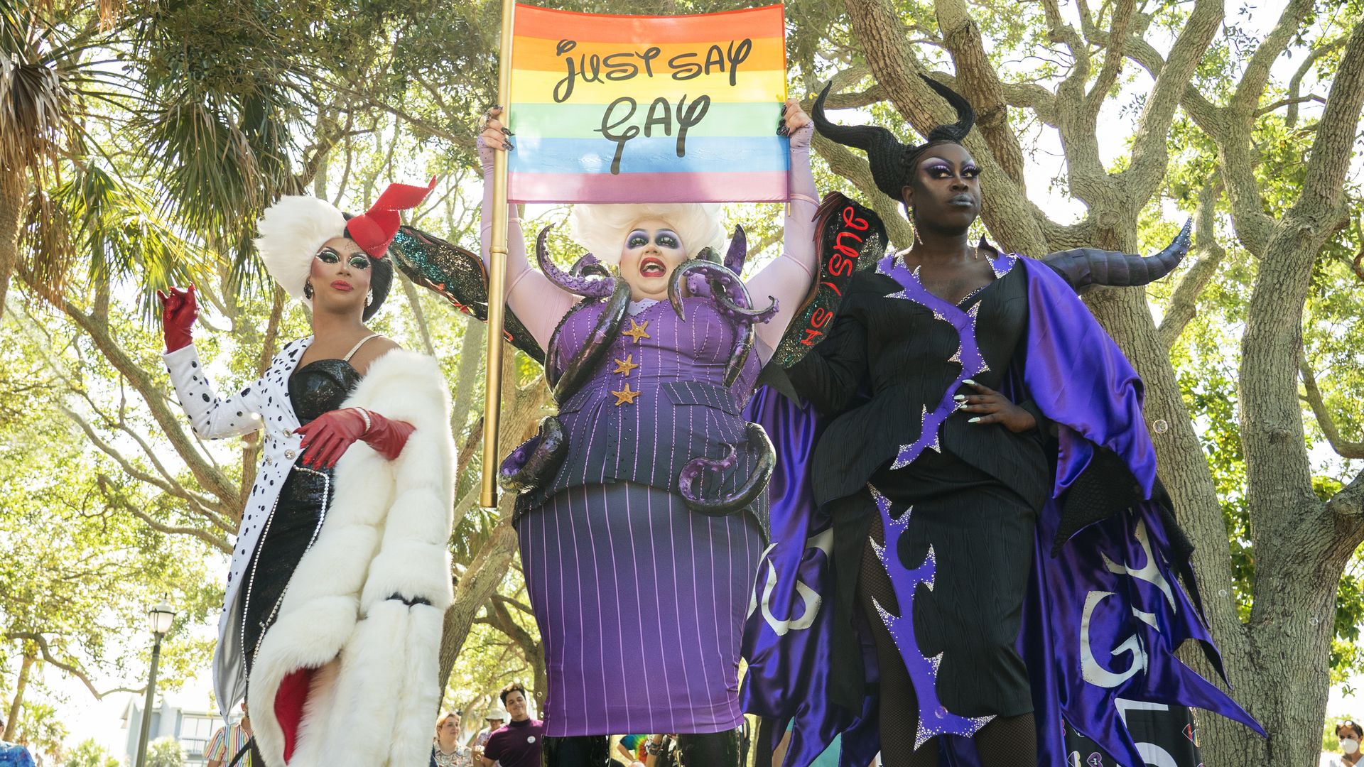 (From left) Shangela, Eureka and Bob the Drag Queen at a “Just Say Gay” rally in Brevard County. Photo: Courtesy of Greg Endries/HBO