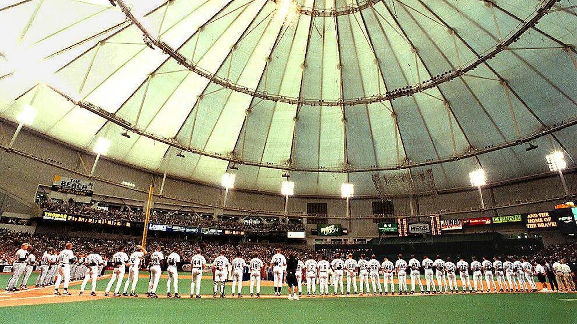The expansion Tampa Bay Devil Rays (R) and the Detroit Tigers (L) in 1998 before Tampa Bay's first game in the new Tropicana Field. Photo: Peter Muhly/AFP via Getty Images