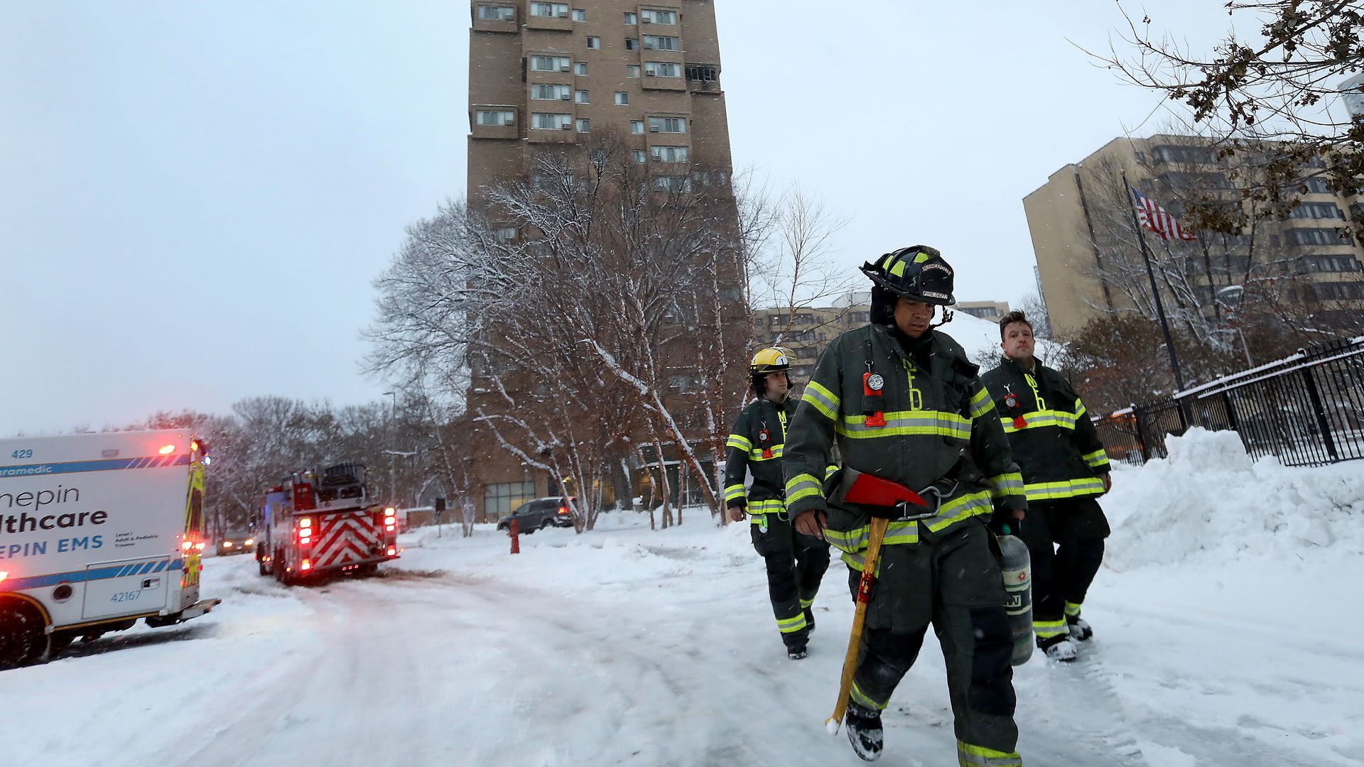 Minneapolis firefighters leave a building in the Cedar-Riverside neighborhood where a fire broke out on the 14th floor of the building in 2019. Photo: David Joles/Star Tribune via Getty Images