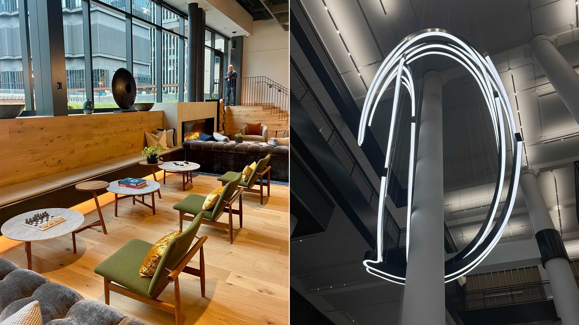 The seventh-floor lounge and the first-floor light fixture, as seen from the basement. Photos: Audrey Kennedy/Axios Twin Cities