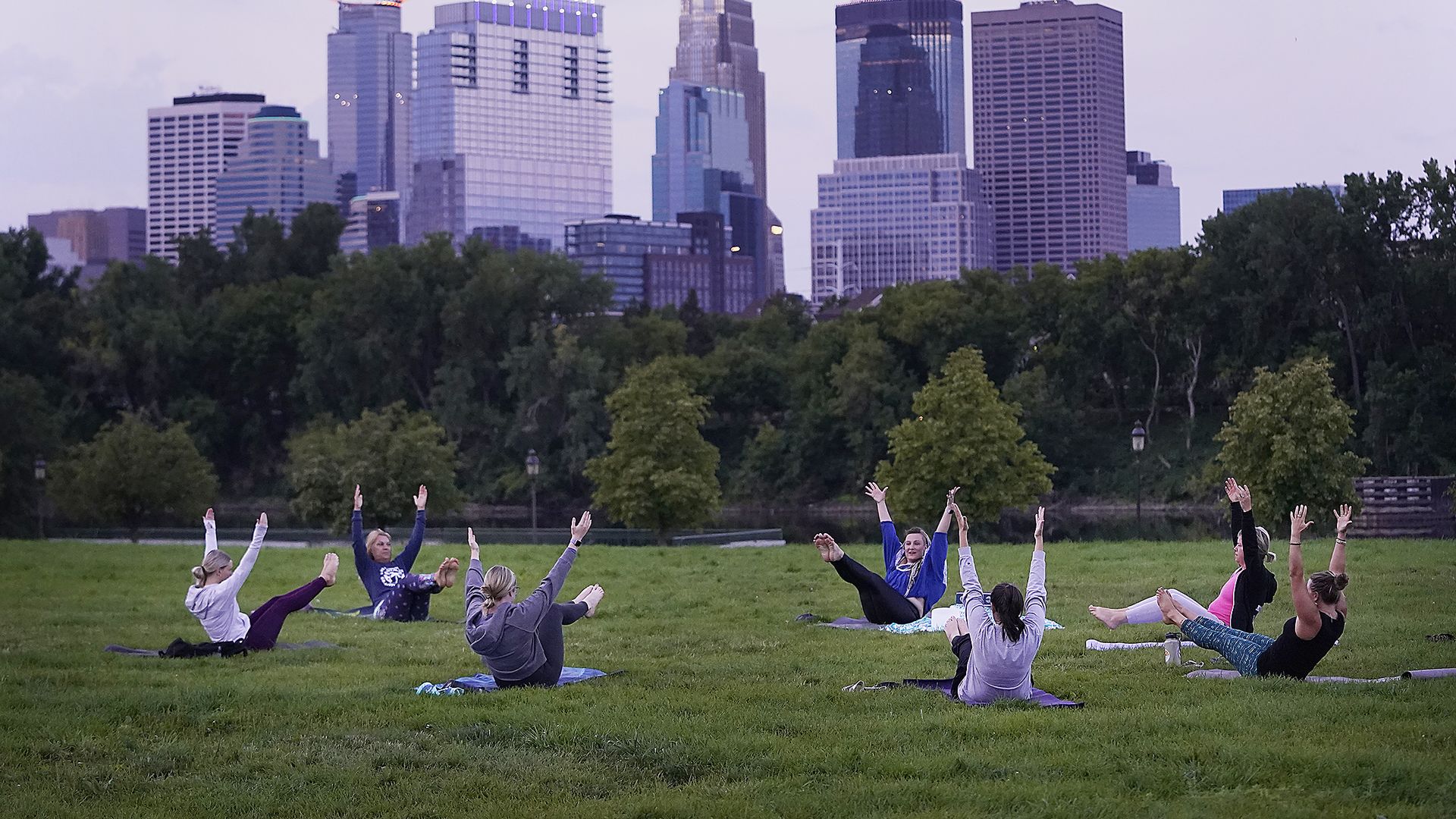 Group yoga at Boom Island Park. Photo: David Joles/Star Tribune via Getty Images