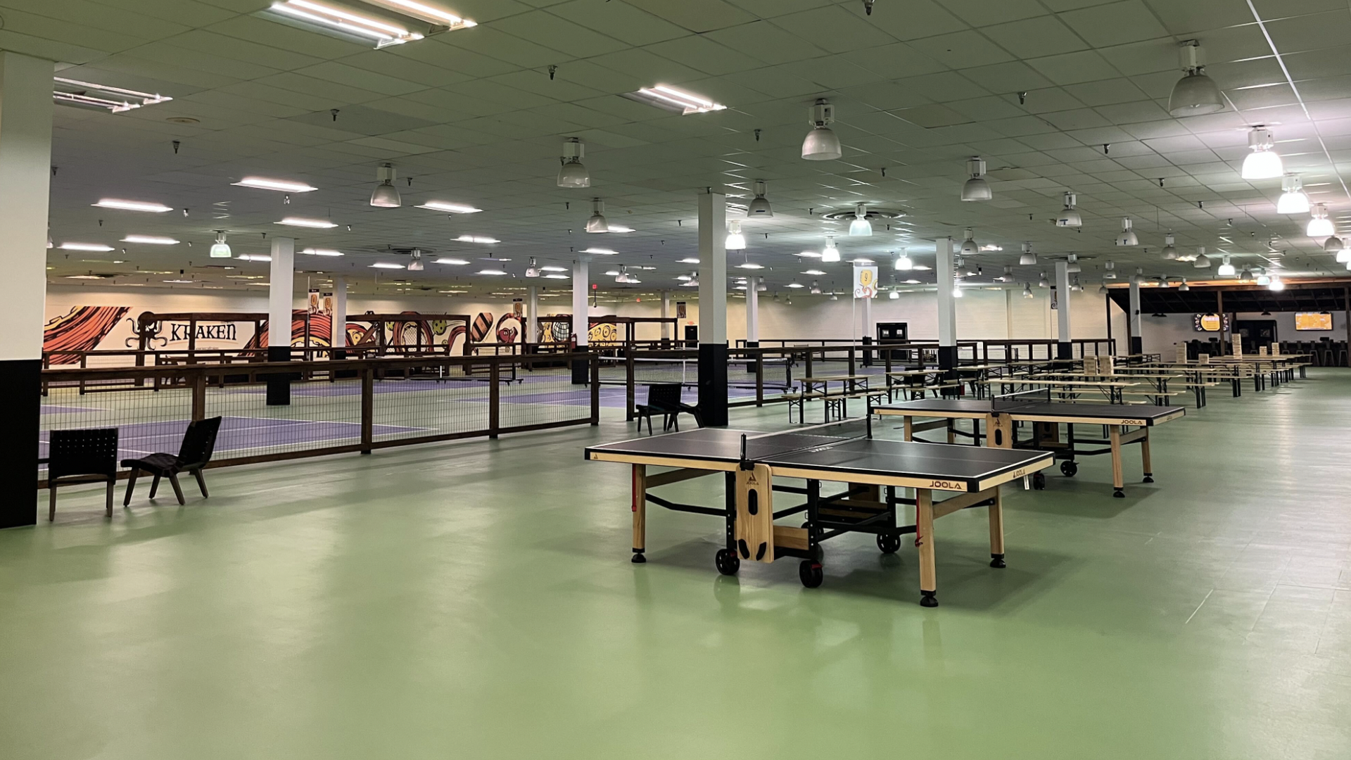 Plus, Kraken Kourts has rows of picnic tables, cornhole, table tennis, and a fully stocked bar that offers alcoholic and non-alcoholic drinks.
