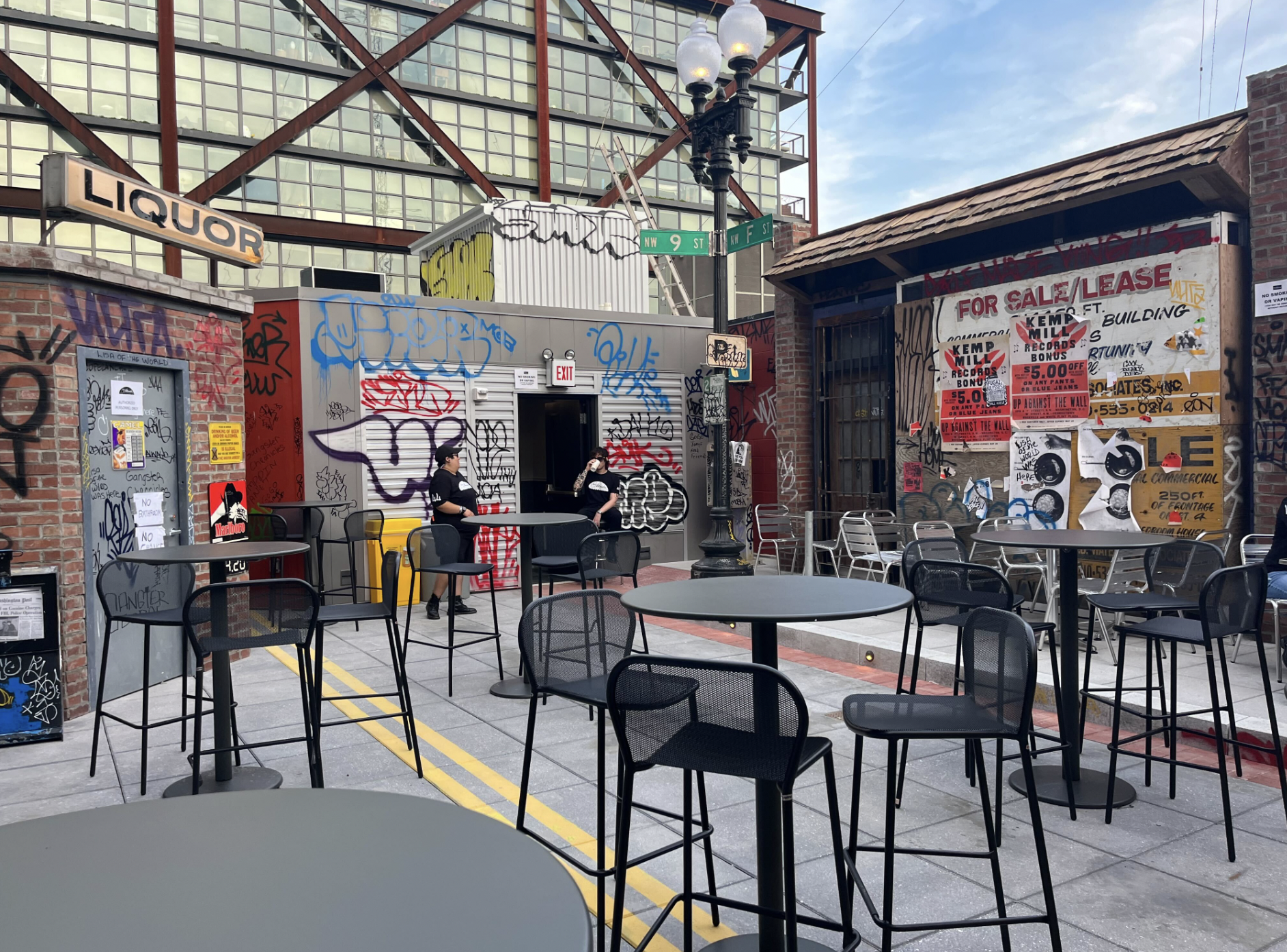 - Designed like a street corner, it features a lamppost with the original 9:30 Club’s cross streets (9th and F streets NW), a payphone, and newspaper stands for local papers including City Paper and the Washington Blade.