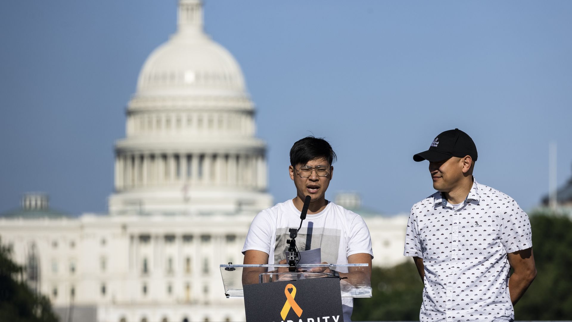 Chefs Kevin Tien (L) and Tim Ma of Chefs Stopping AAPI Hate at a rally on the National Mall in 2021. Photo: Samuel Corum/Getty Images
