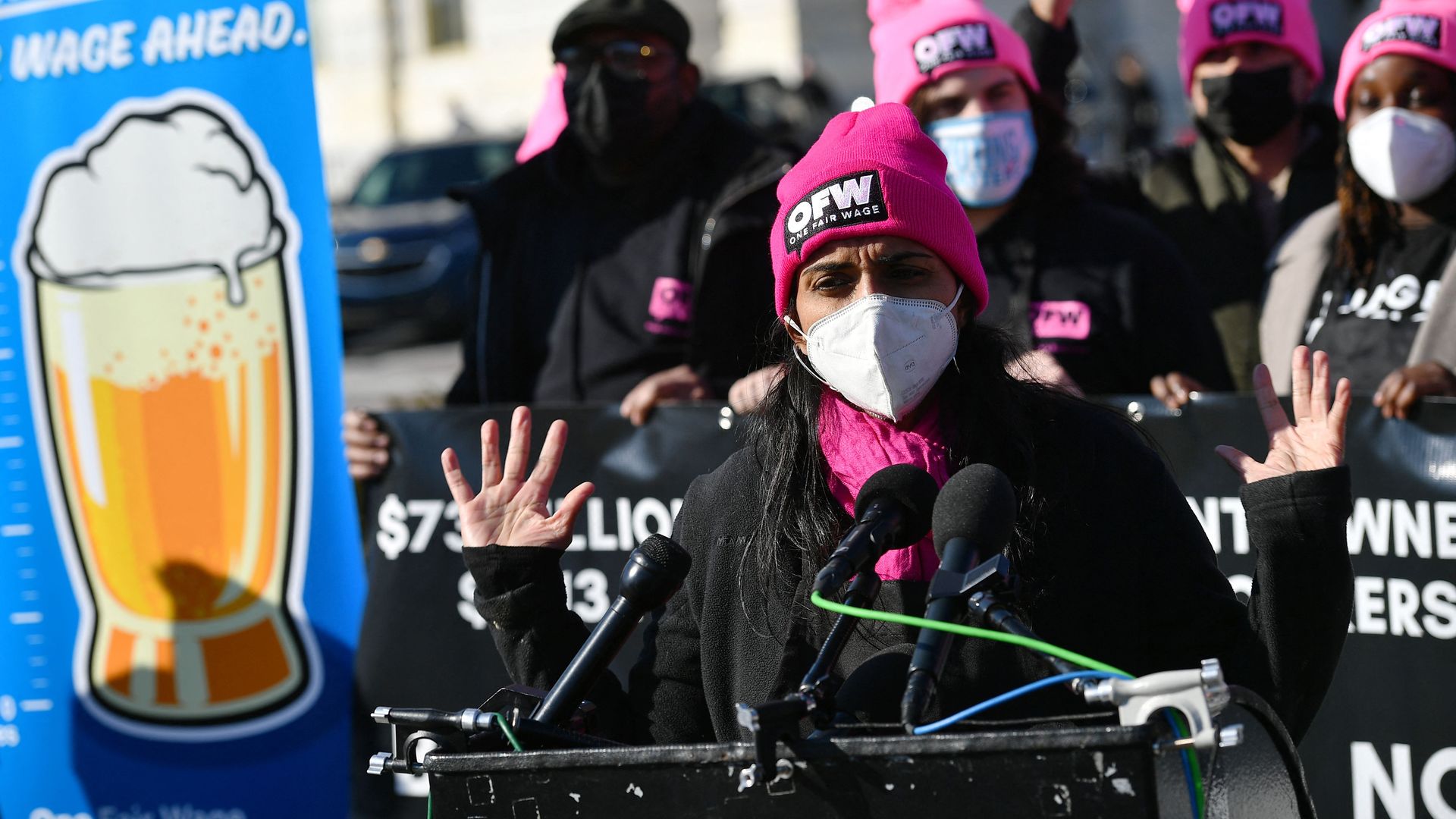- The group's president, Saru Jayaraman, demanded "a full minimum wage with tips on top." They believe that higher wages don't impact tips, citing data from financial services platform Square that show diners did not tip less in states that ended the subminimum wage.