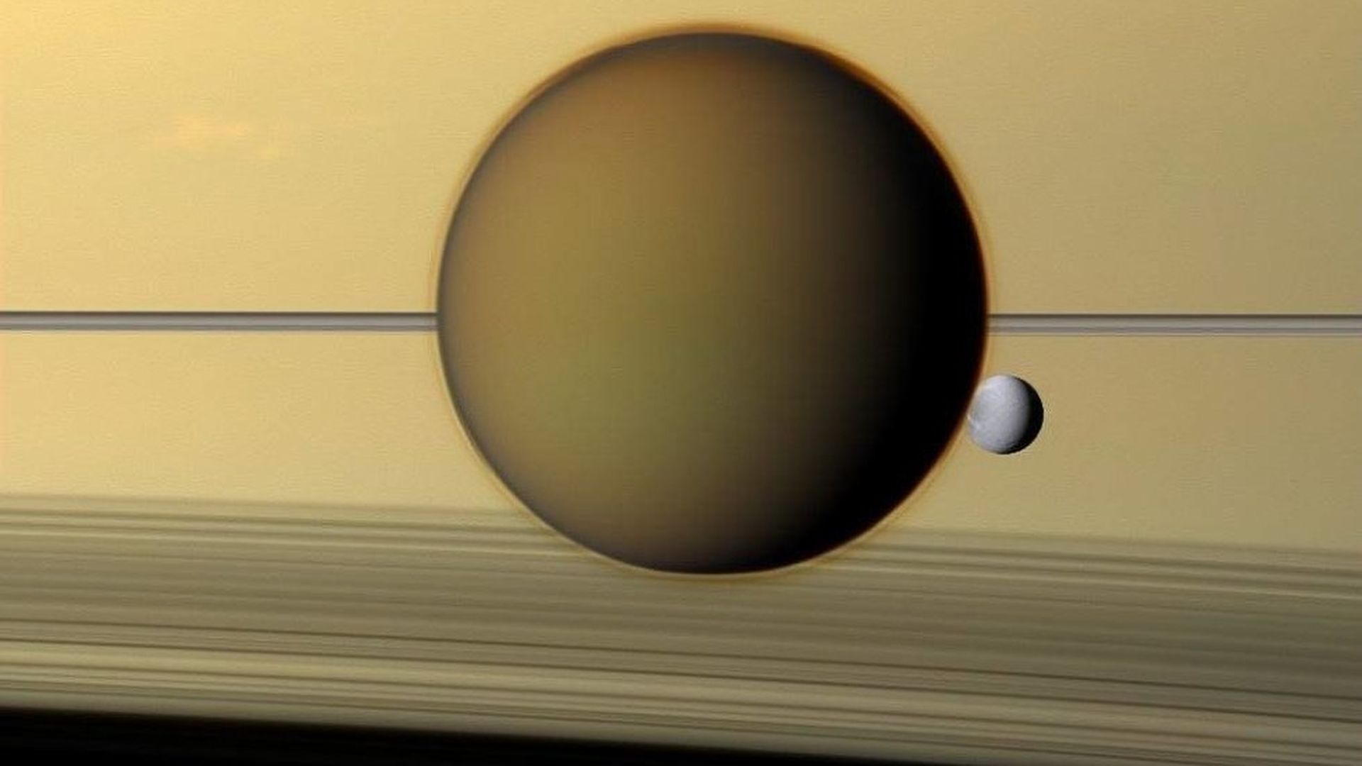 Saturn's third-largest moon Dione can be seen through the haze of its largest moon, Titan, in this view from NASA's Cassini spacecraft. Credit: NASA / JPL-Caltech / Space Science Institute
