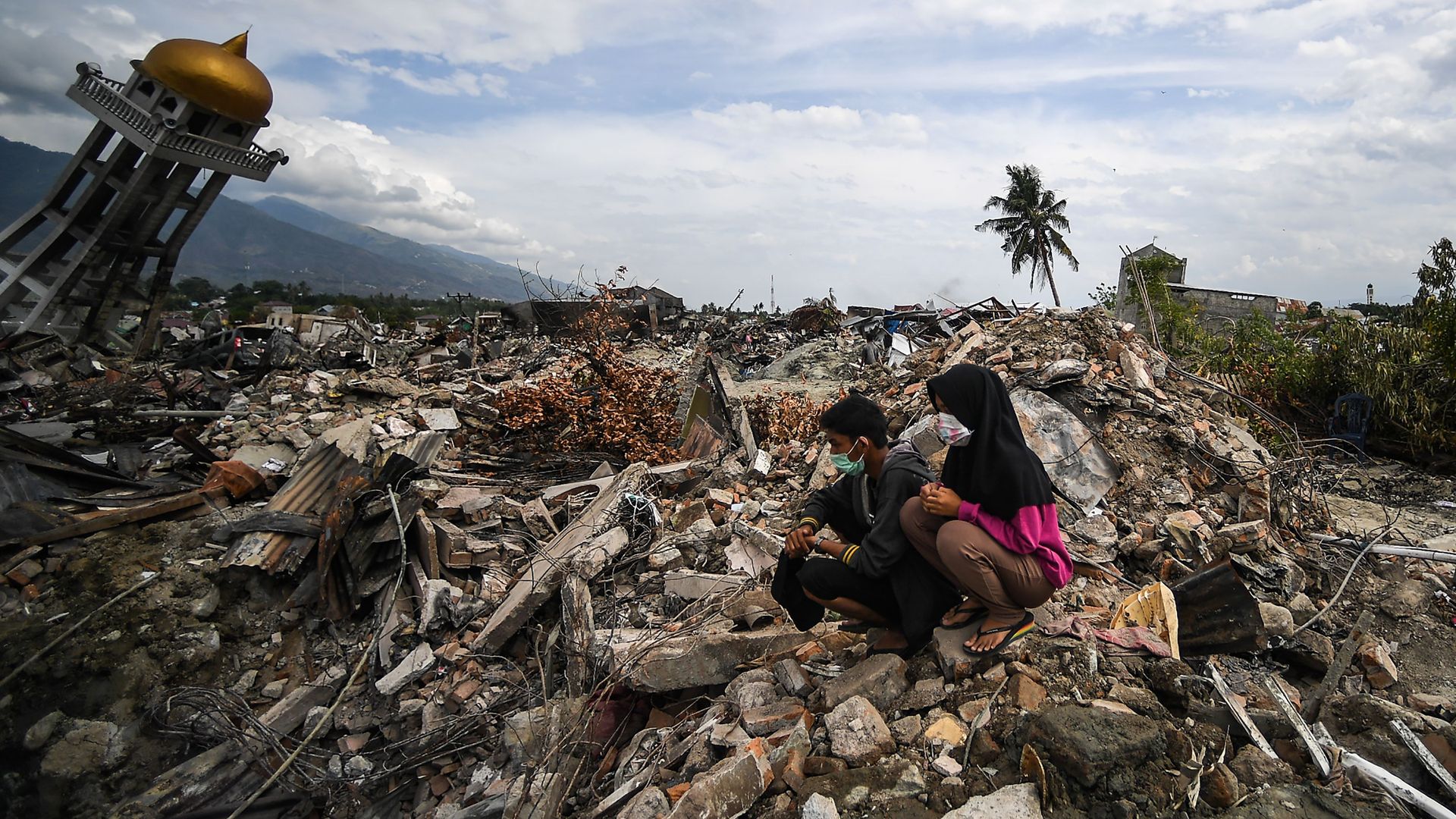 Residents sit among debris at Perumnas Balaroa village in Palu. Photo: Mohd Rasfan/AFP/Getty Images