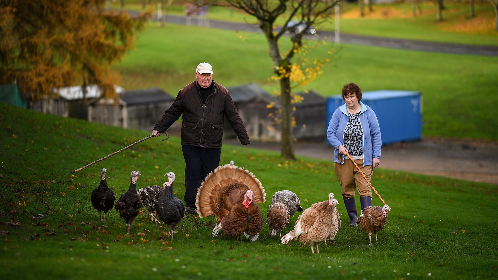 Retired businessman Brian Moodie, 74, and his sister, Gillian Moodie, take his turkeys for a walk near his home in Camelon, Scotland. Photo: Jeff J Mitchell/Getty Images