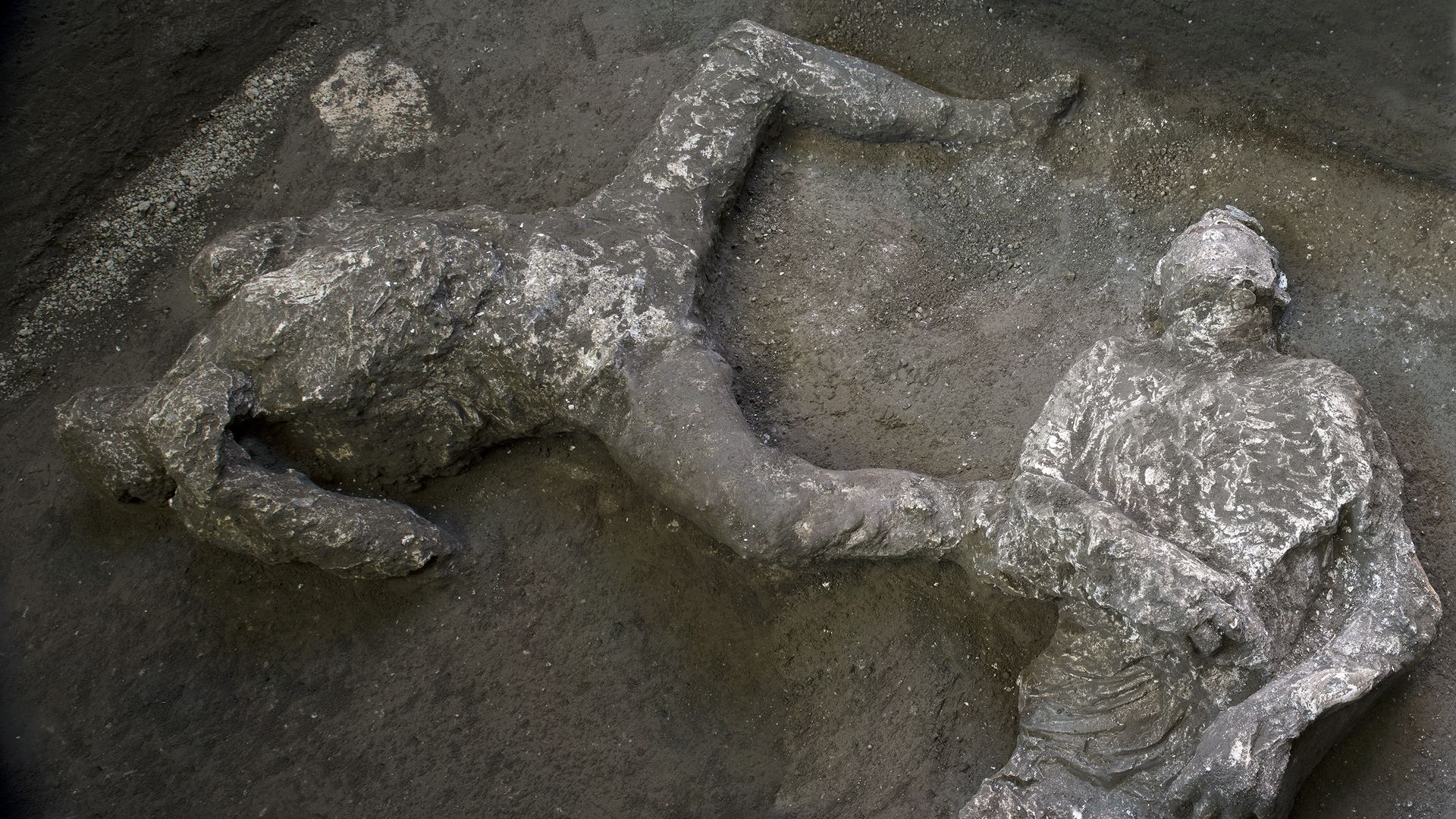 These are casts of what are believed to have been a rich man and his male slave fleeing the volcanic eruption of Vesuvius nearly 2,000 years ago, in what was an elegant villa on the outskirts of the ancient Roman city of Pompeii, AP reports.