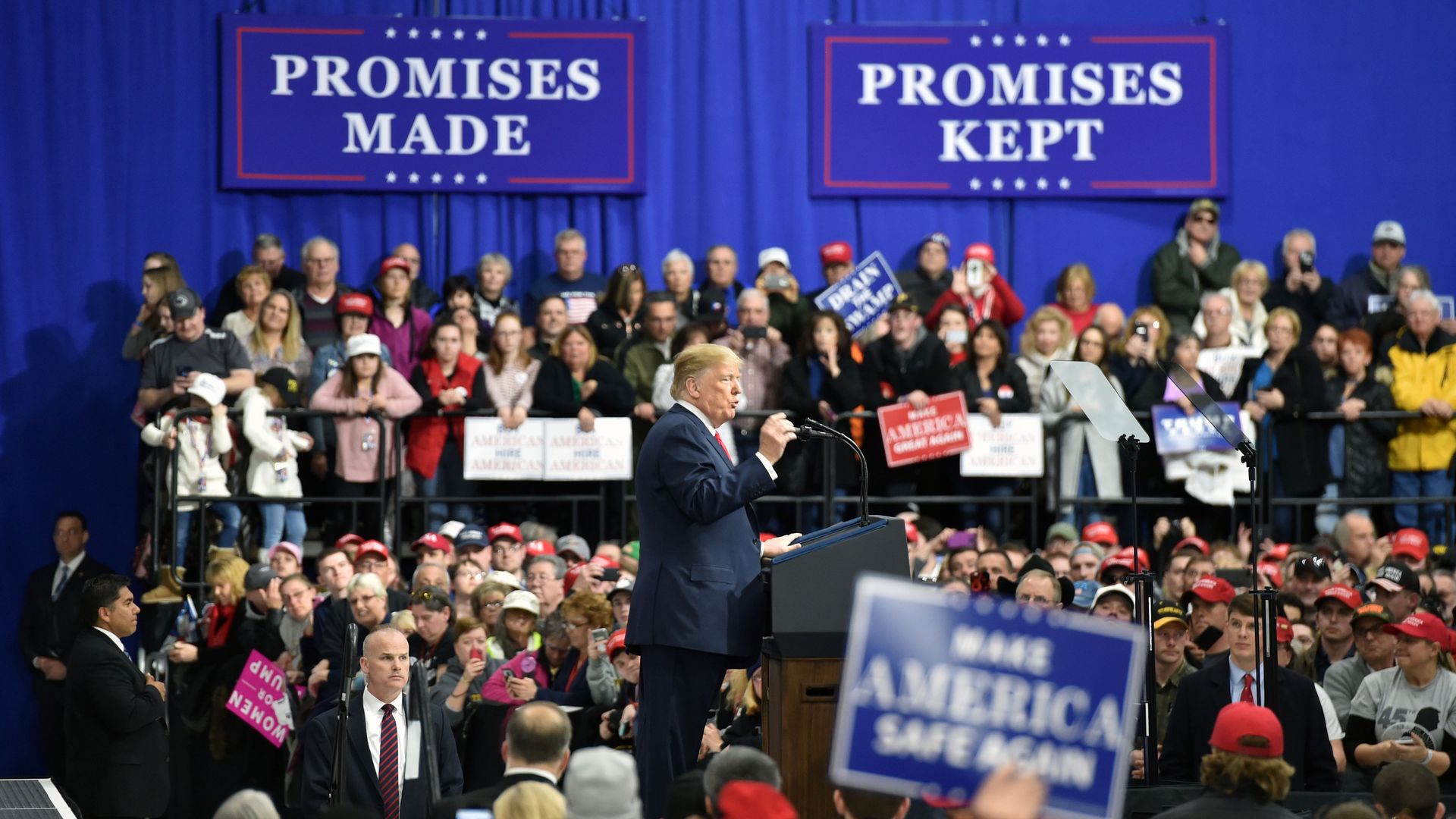- The targets: "[W]e have to defeat Nancy Pelosi [boos] and Maxine Waters, a very low IQ individual. You ever see her? ... 'We will impeach him.' She's a low IQ individual. You can't help it. She really is."