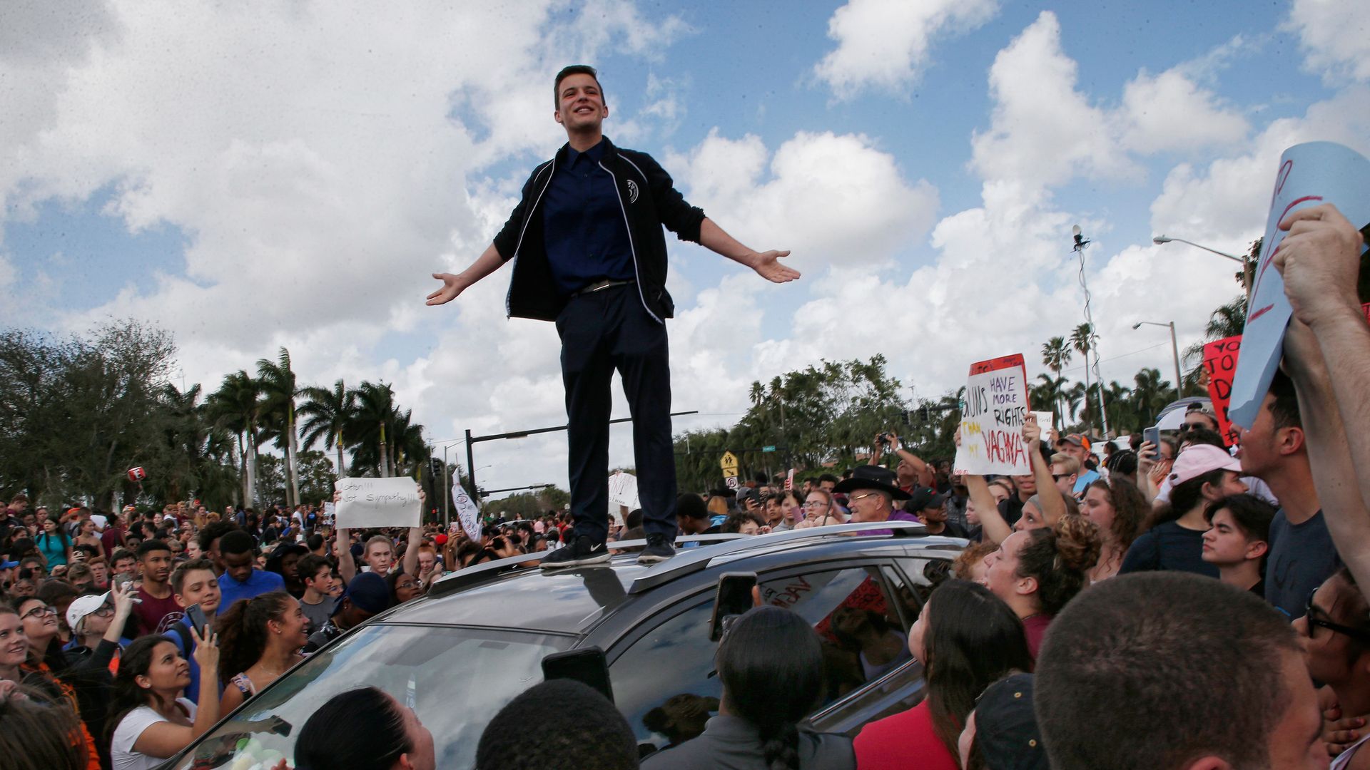 Cameron Kasky addresses area high schoolers as they rally at Marjory Stoneman Douglas High School during a school walkout Feb. 21. (Rhona Wise / AFP / Getty Images)