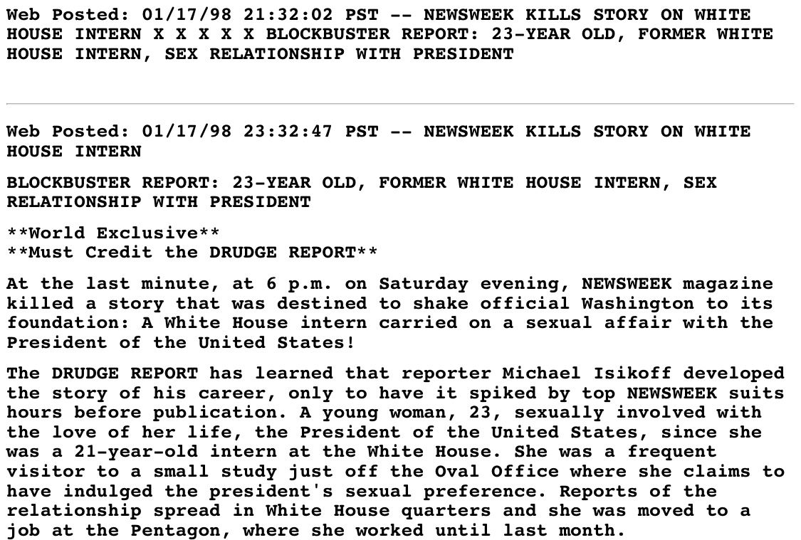20 years ago today, back in 1998, Matt Drudge posted his most famous siren banner: "NEWSWEEK KILLS STORY ON WHITE HOUSE INTERN."