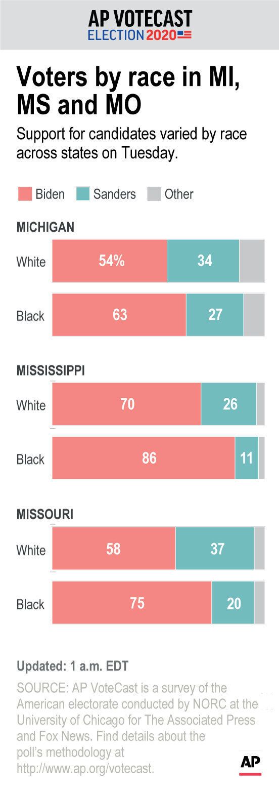 Joe Biden decisively won four more states — Michigan, Missouri, Mississippi and Idaho — and party elders said Bernie Sanders should bow to the inevitable.