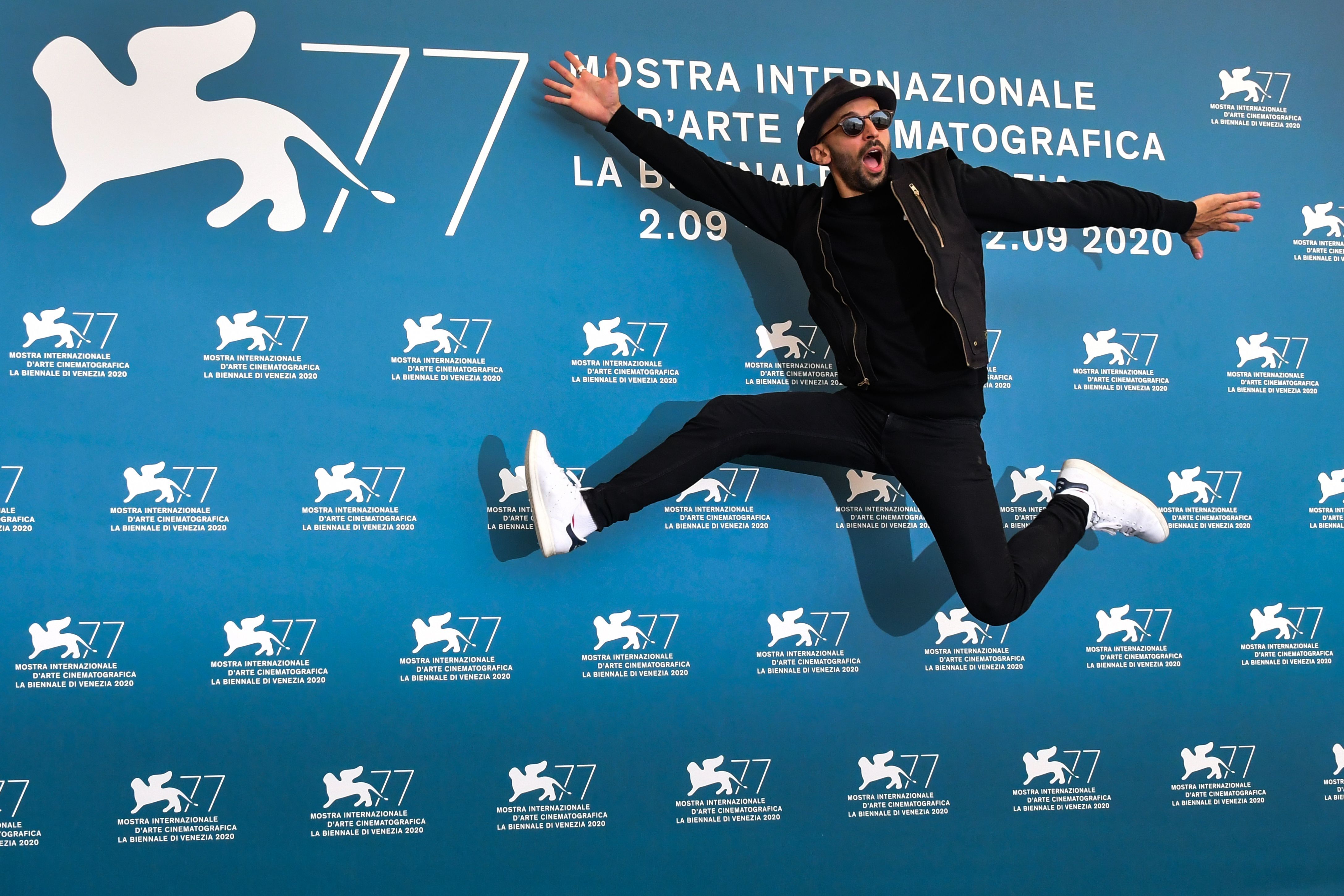 French director, photographer and street artist JR jumps during a photocall for the film "Omelia Contadina" during the 77th Venice Film Festival.