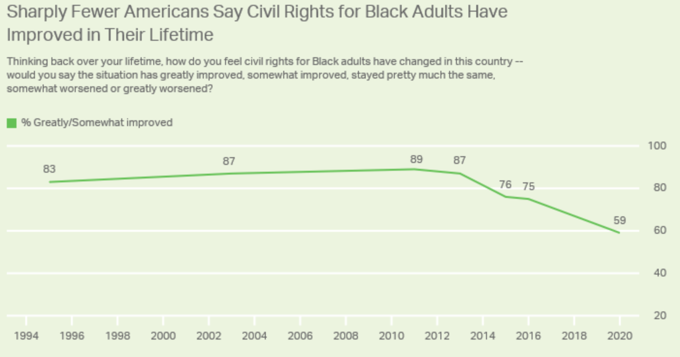 59% of U.S. adults believe Black civil rights have improved in their lifetime, down from 89% in 2011, during President Obama's first term, Gallup found.