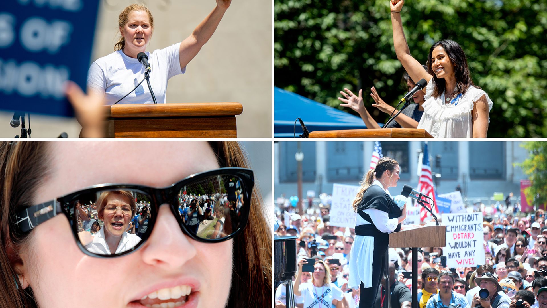 Clockwise from upper left: Amy Schumer at Saturday's New York rally (Roy Rochlin/Getty) ... Padma Lakshmi in New York (Roy Rochlin/Getty) ... Chrissy Teigen holds her baby in L.A. (Frederic J. Brown/AFP/Getty) ... Sen. Elizabeth Warren in the sunglasses of Arian Rustemi at Boston rally (Winslow Townson/AP)