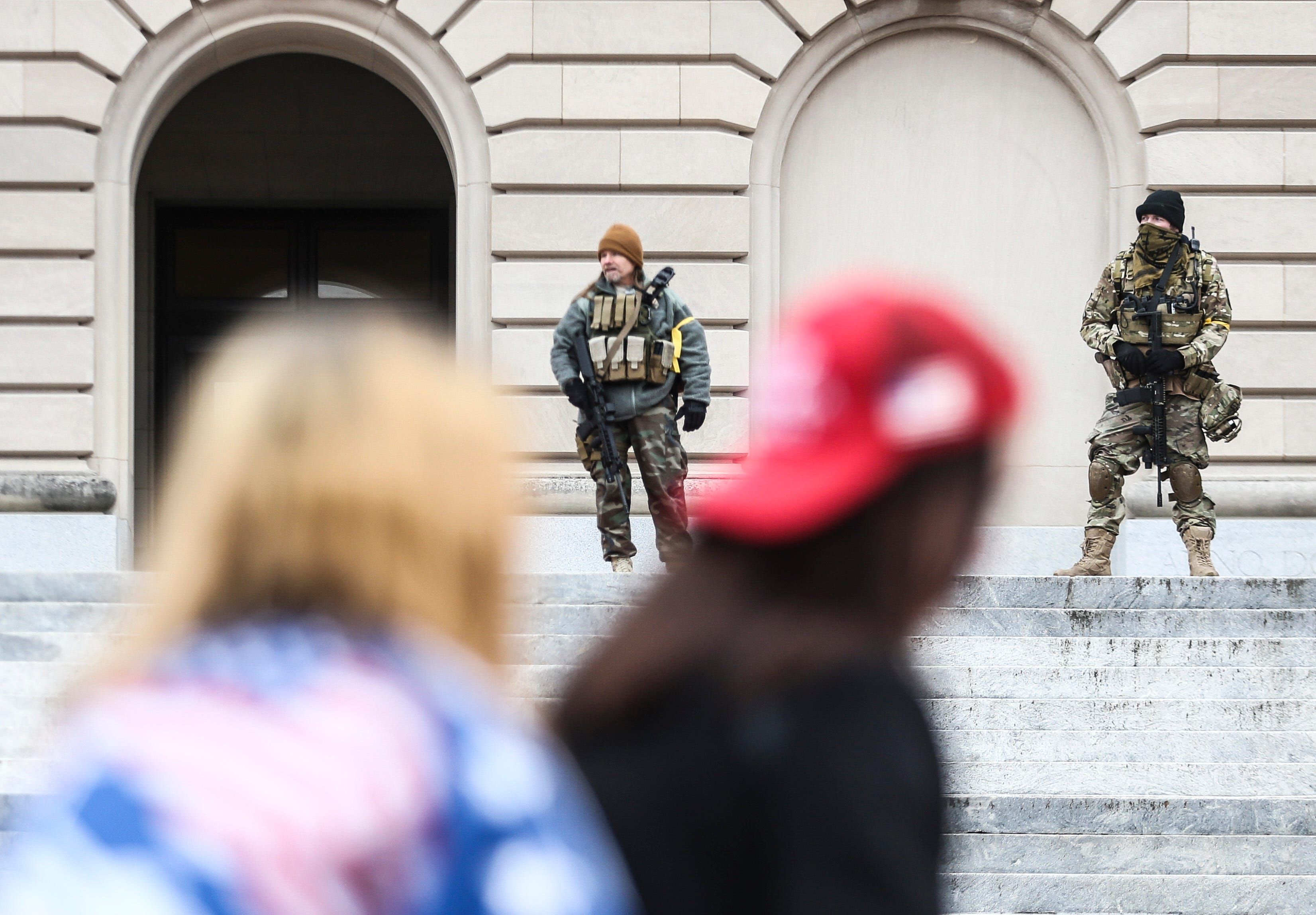 In Frankfort, Ky., two "militia members" carried guns outside the Kentucky capitol as state senators and representatives met inside.