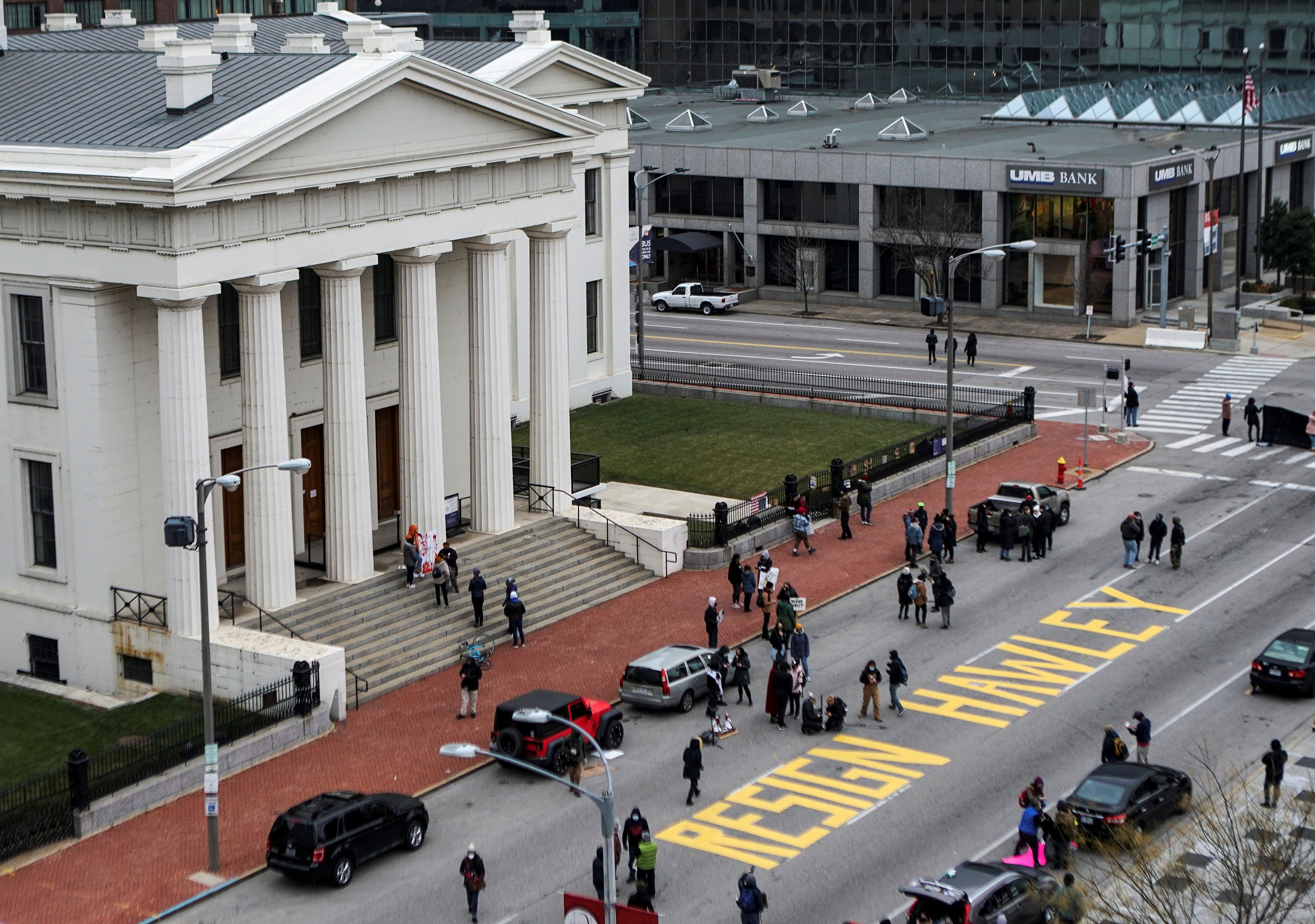 "RESIGN HAWLEY" is painted on a St. Louis street during a protest against Sen. Josh Hawley (R-Mo.), who led objections to the Electoral Vote certification.