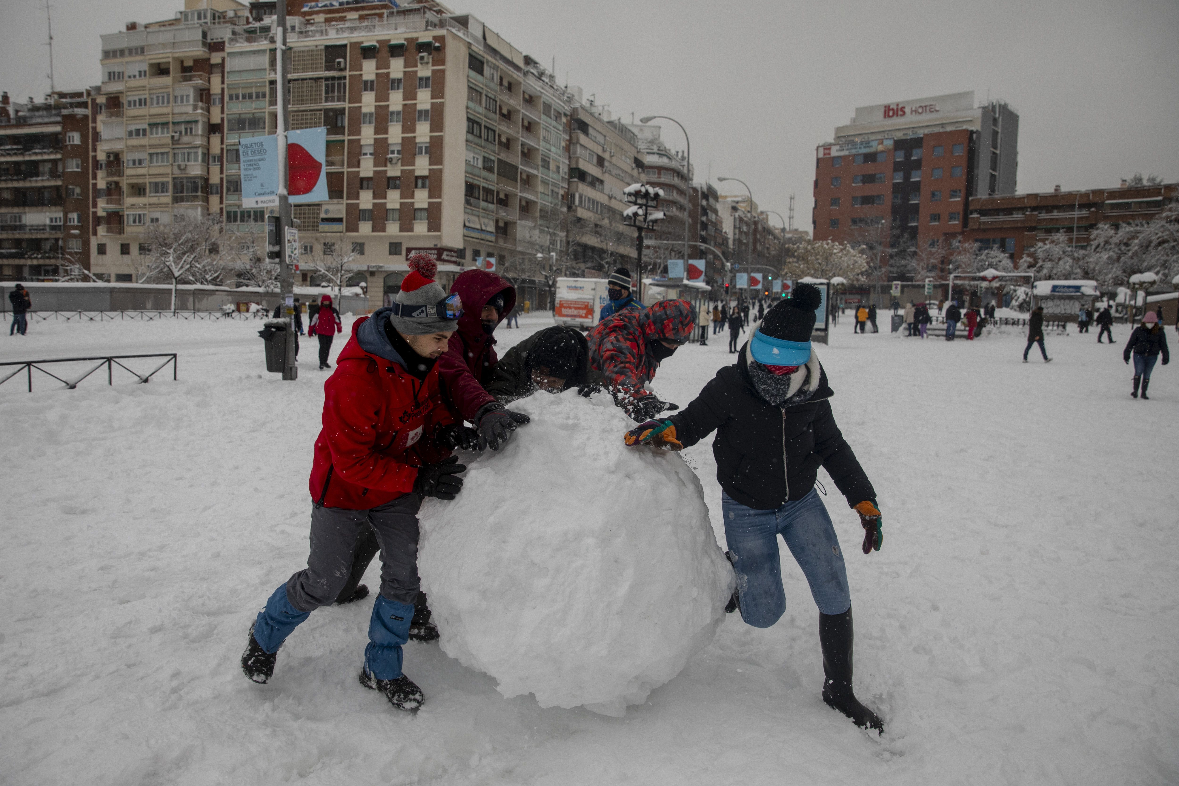 Madrid had unusually heavy snowfall yesterday, closing transit and producing this fun in a plaza near Las Ventas, the biggest bullfighting ring in Spain.