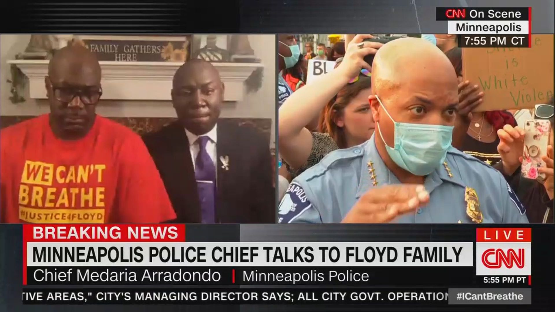 In a spontaneous moment carried live on CNN, Minneapolis Police Chief Medaria Arradondo doffed his cap in a sign of respect and told the family of George Floyd, through a reporter, that he believes the other three officers are as guilty as the one who has been charged: "Silence and inaction, you're complicit."