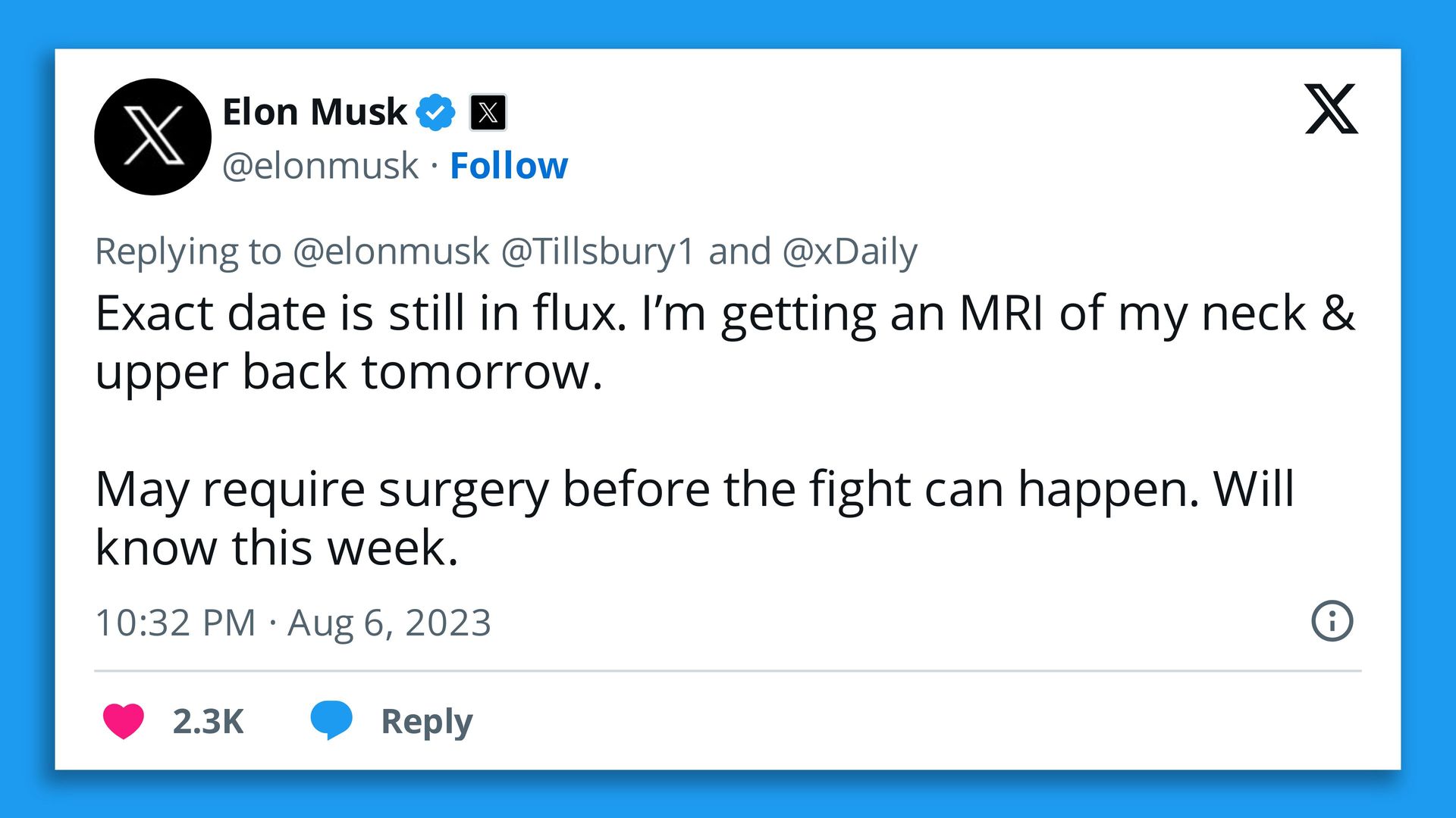 "Zuck v Musk fight will be live-streamed on ๐," Elon Musk wrote yesterday to his 152 million followers on his platform formerly known as Twitter.