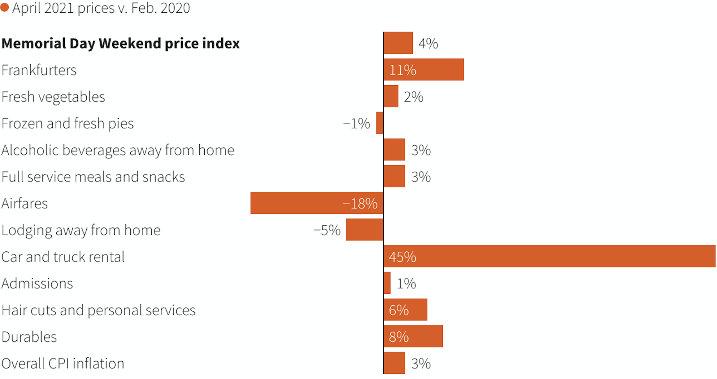 - This "Memorial Day Weekend price index" (graphic above) showed leisure-related prices up about 4.3% since the pandemic began— more than overall consumer prices, which rose 3.1% over that period.