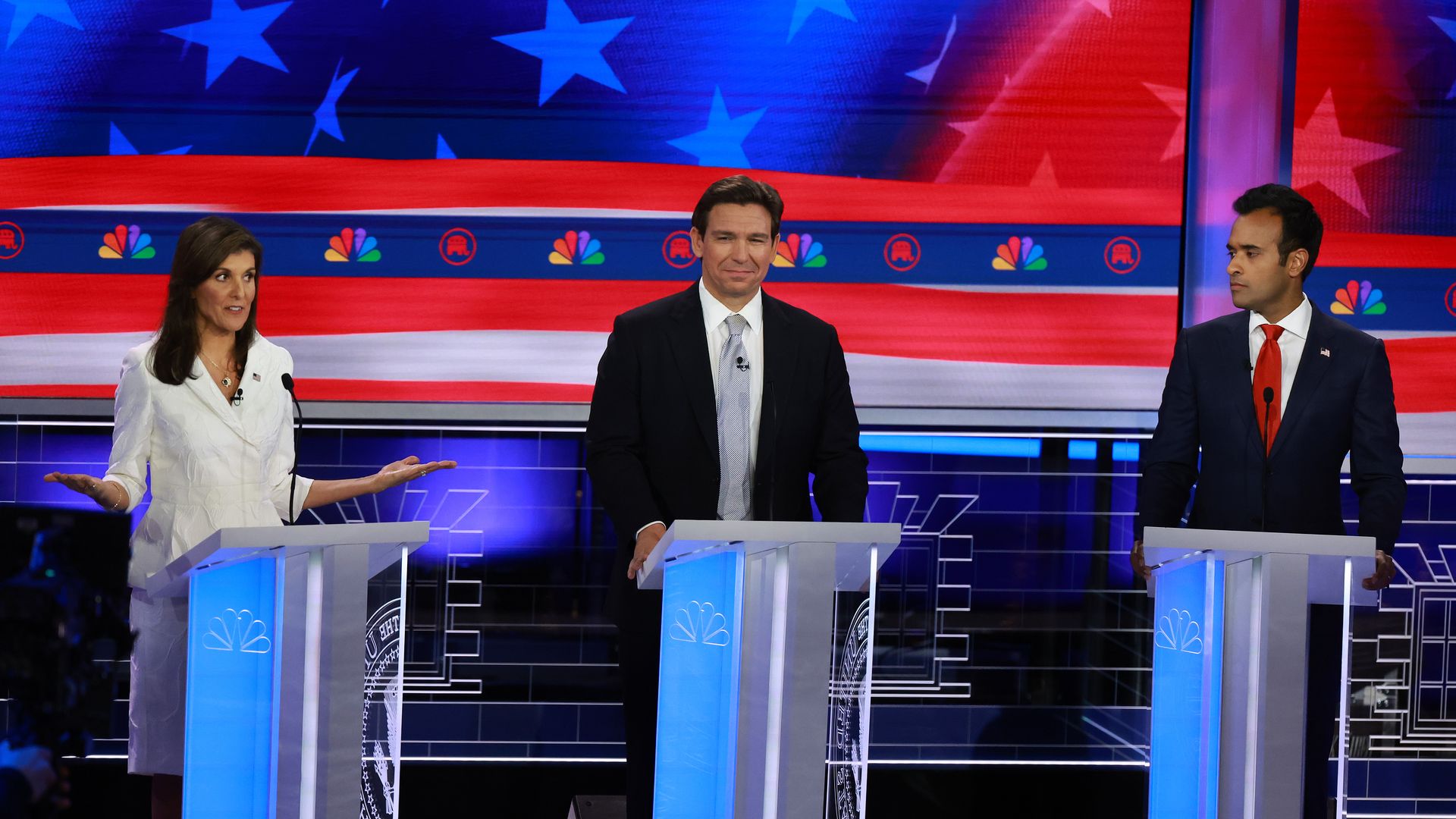 Nikki Haley, Ron DeSantis and Vivek Ramaswamy. Photo: Joe Raedle/Getty Images