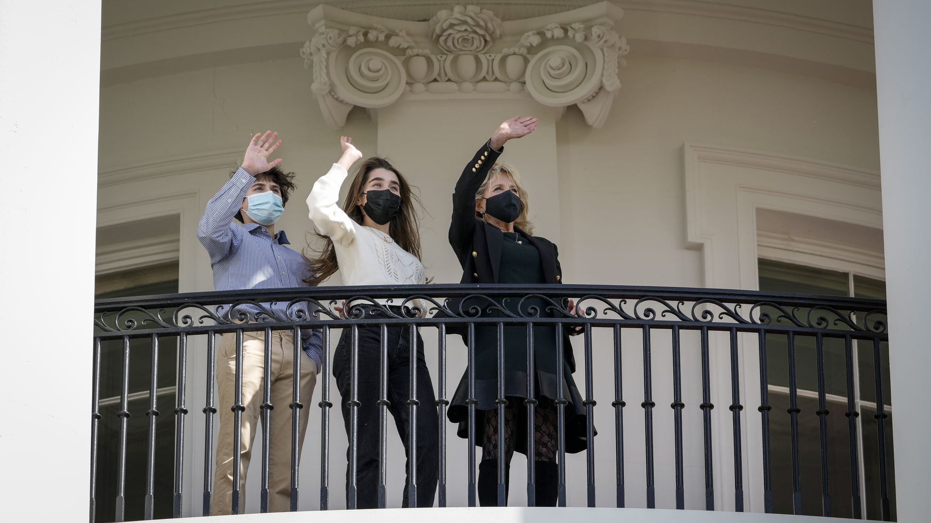 Grandchildren Robert Hunter Biden III and Natalie Biden, and Dr. Jill Biden, wave as President Biden takes off from the South Lawn on Marine One yesterday. Photo: Drew Angerer/Getty Images