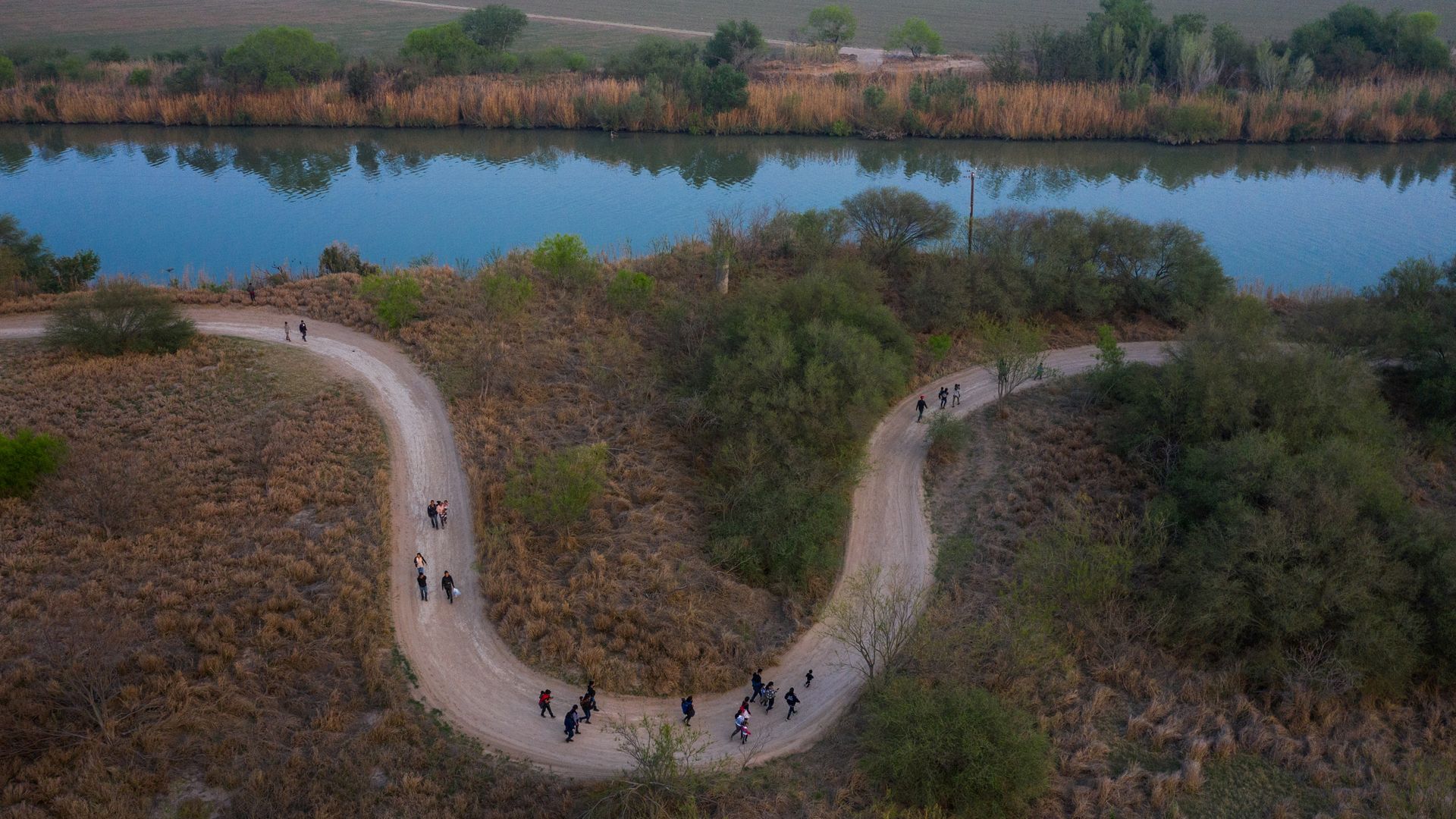 Asylum-seeking families and unaccompanied minors from Central America walk toward the border wall in Peñitas, Texas, after crossing the Rio Grande into the U.S. from Mexico on rafts.