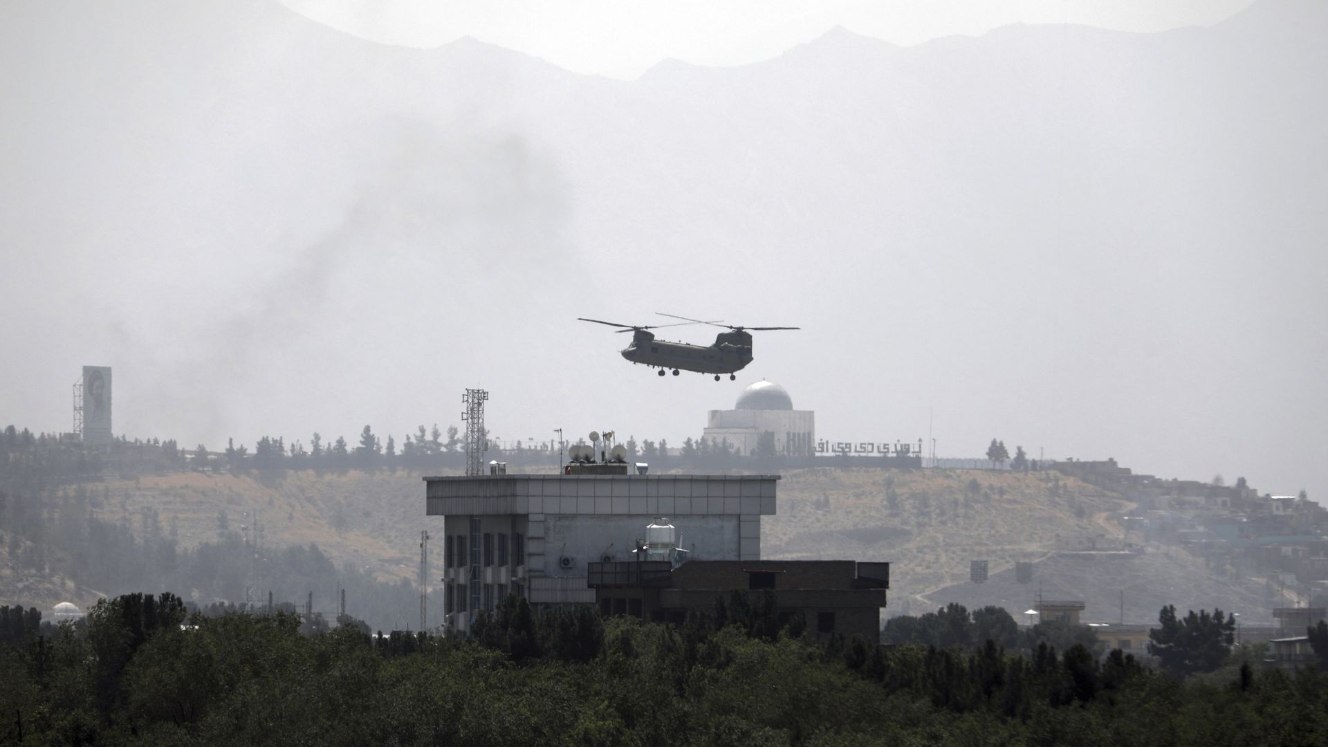 Smoke rises next to the U.S. embassy in Kabul, as Taliban fighters enter the outskirts of the Afghan capital.