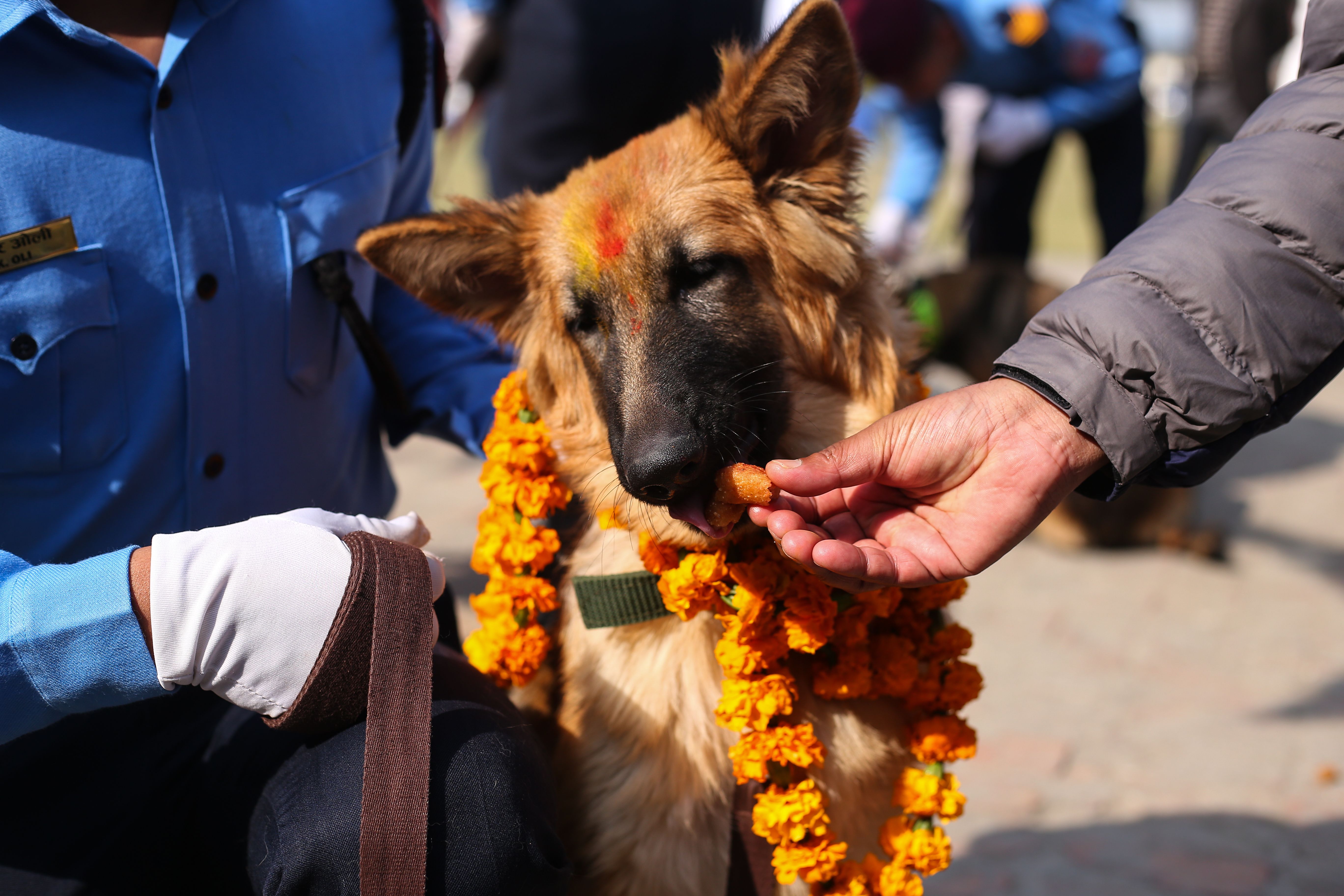 Below: A police dog in Kathmandu, Nepal, gets a treat. On the second day of Nepal's festival of lights, Tihar, Hindus worship and celebrate dogs as loyal companions.