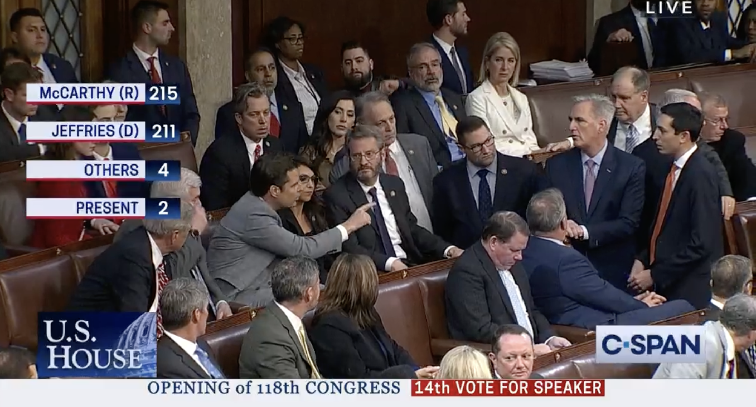 - Gaetz, Biggs and four co-conspirators changed their votes to "present," allowing McCarthy to win with 216 votes, at 12:37 a.m.