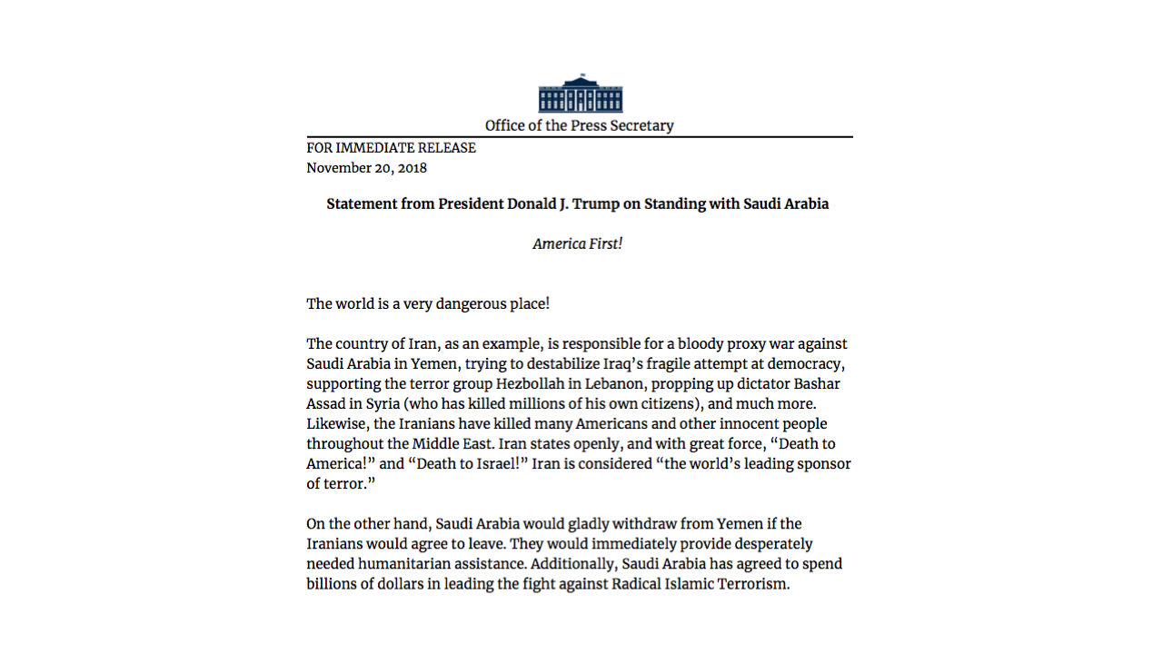 WashPost lead headline ... "Trump backs prince in Khashoggi case: TAKES AUTOCRAT’S WORD OVER CIA'S."