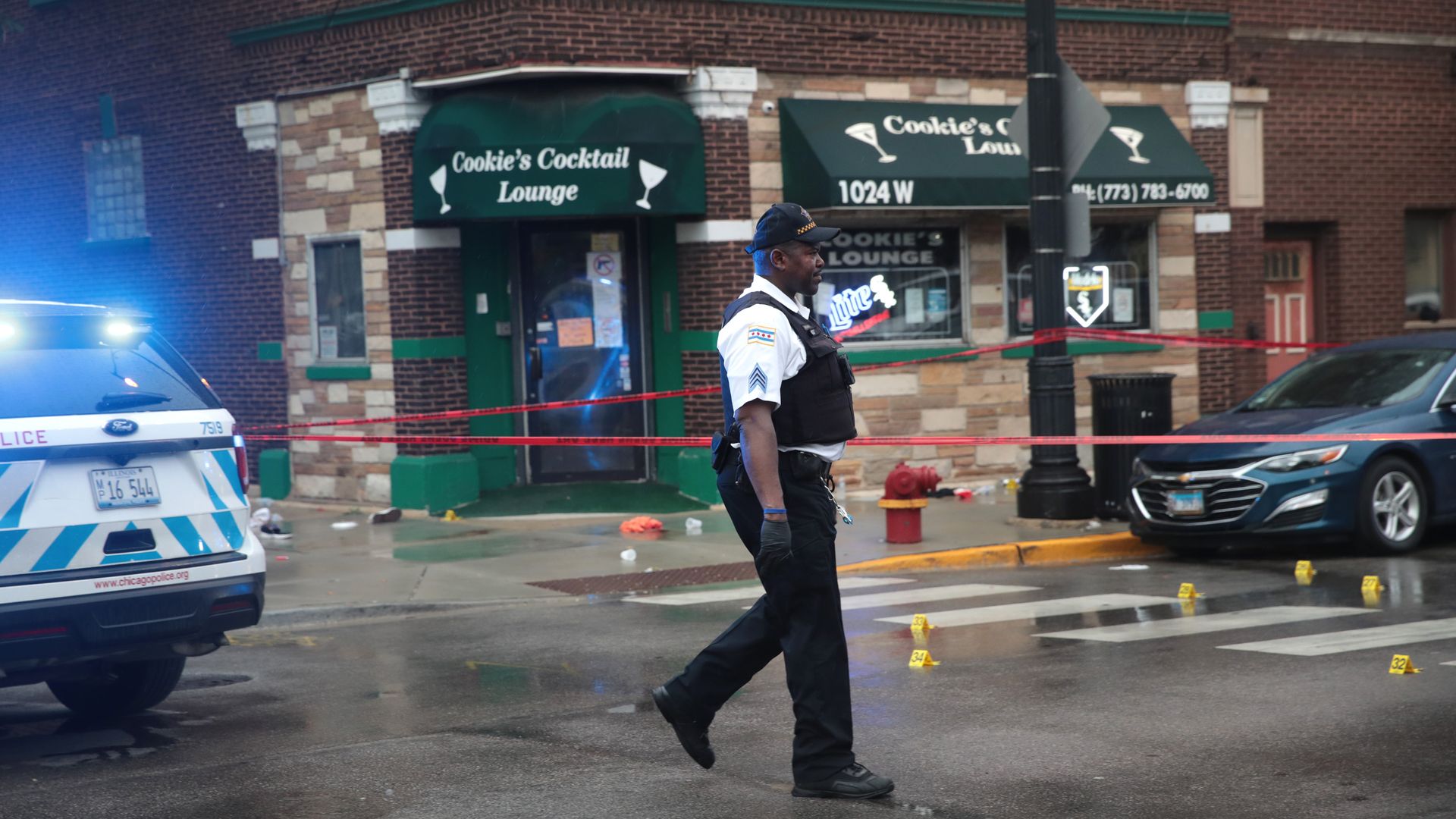 Shell casing markers litter the ground as police investigate a shooting in Chicago on July 21. At least 14 people were taken to hospitals. Photo: Scott Olson/Getty Images