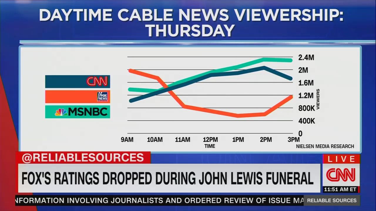 From Brian Stelter's weekly "Reliable Sources" show on CNN, this fascinating window into cable-news viewing patterns, keyed to the 11 a.m. funeral for Rep. John Lewis: