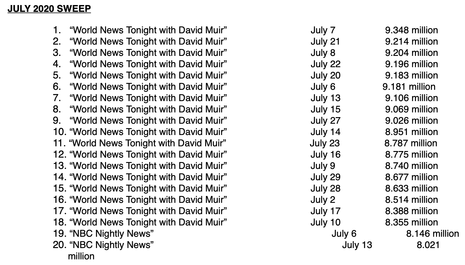 With no Olympics, and "60 Minutes" and other shows in summer reruns, ABC's "World News Tonight with David Muir" — for weeks — has been the most watched show on all of television.