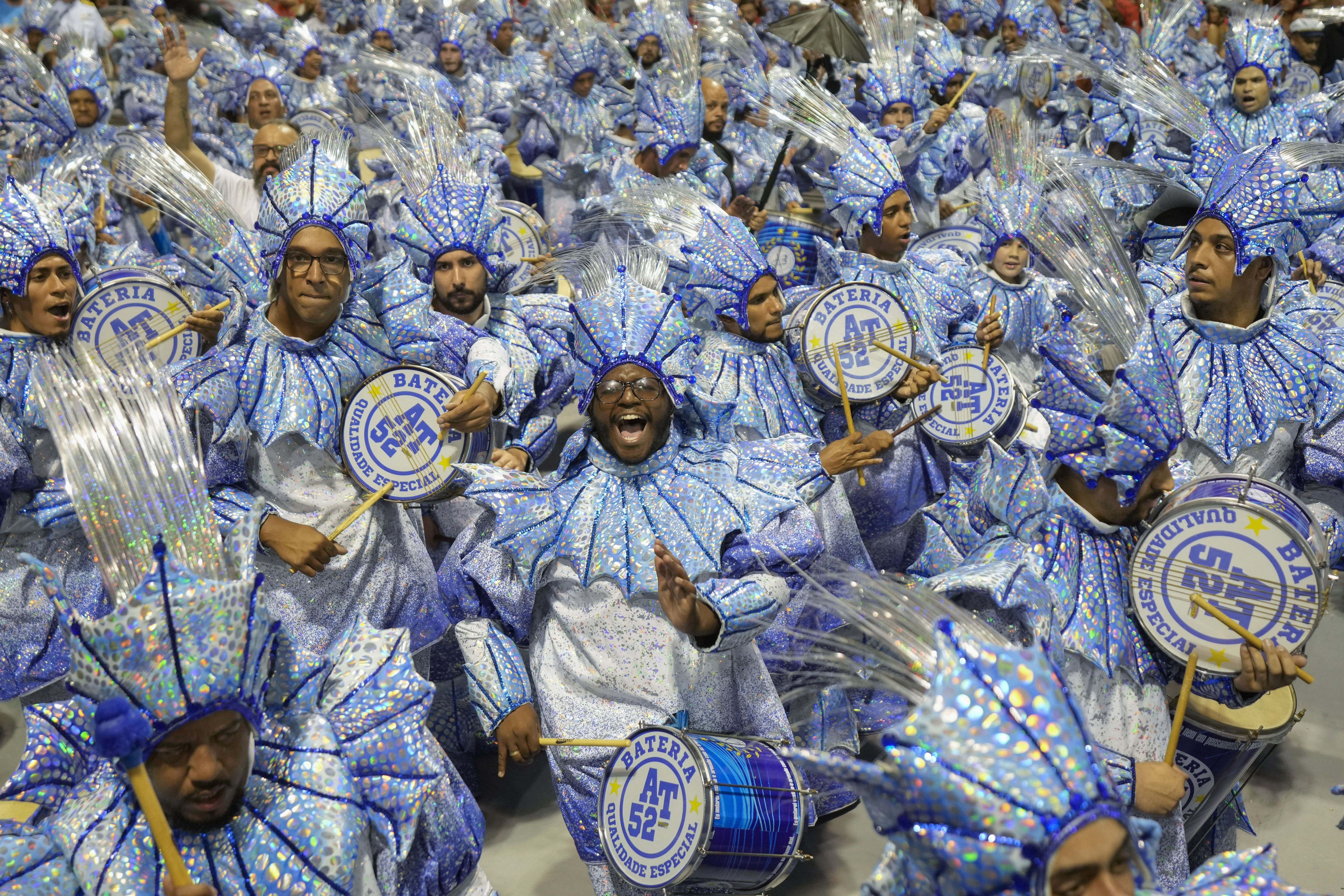 Drummers perform samba music during a carnival parade in Sao Paulo early Saturday. Brazil's government projects 46 million people will join in the multi-day celebration, Al Jazeera notes.