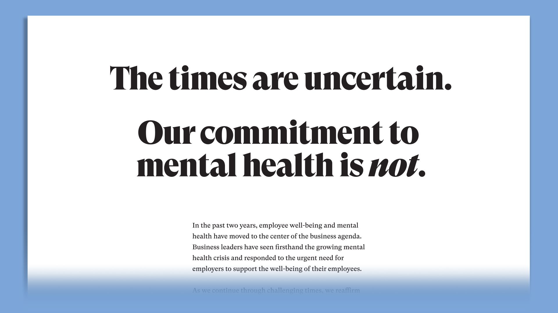 In this full-page ad in today's New York Times, major companies and nonprofits pledge "to continue prioritizing the well-being and mental health of our employees through the uncertain times that lie ahead."