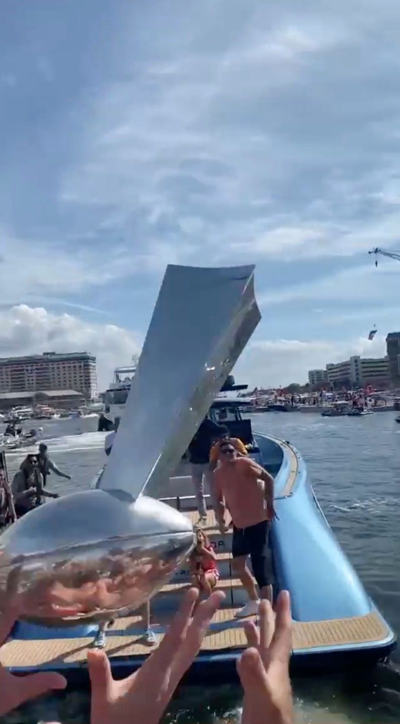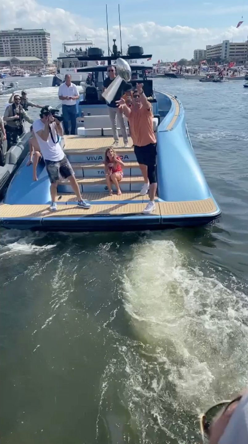 During a boat parade celebrating the Tampa Bay Bucs' Super Bowl title, Tom Brady tossed the NFL's Lombardi Trophy to tight end Cameron Brate in another boat. Of course, the shirtless Brate caught the 10-yard, underhanded pass.