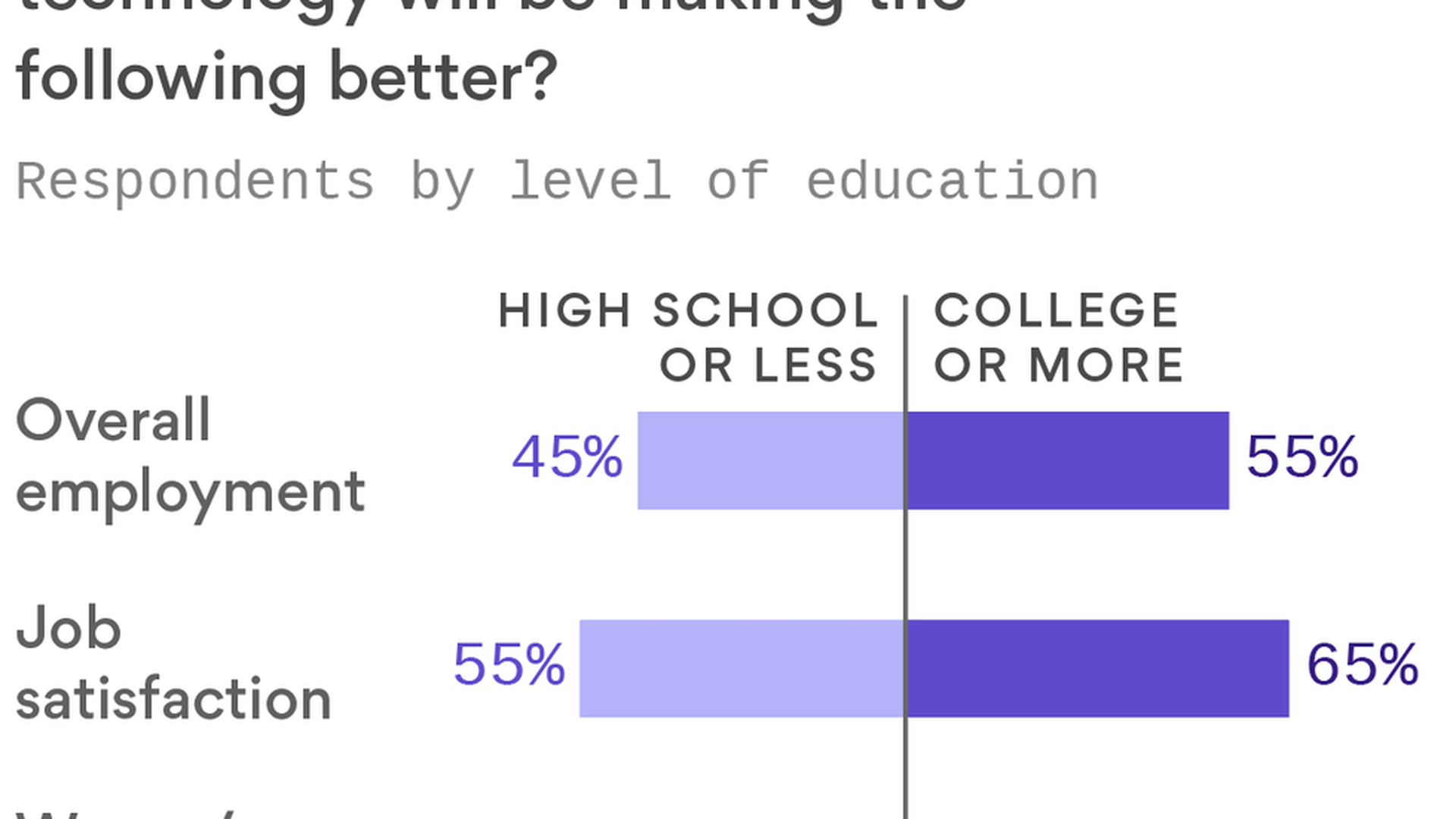 - "When it comes to job security and the role of automation, only 14 percent of Americans with a college education or more say a machine could replace their job in five years, versus 30 percent with a high school education or less."