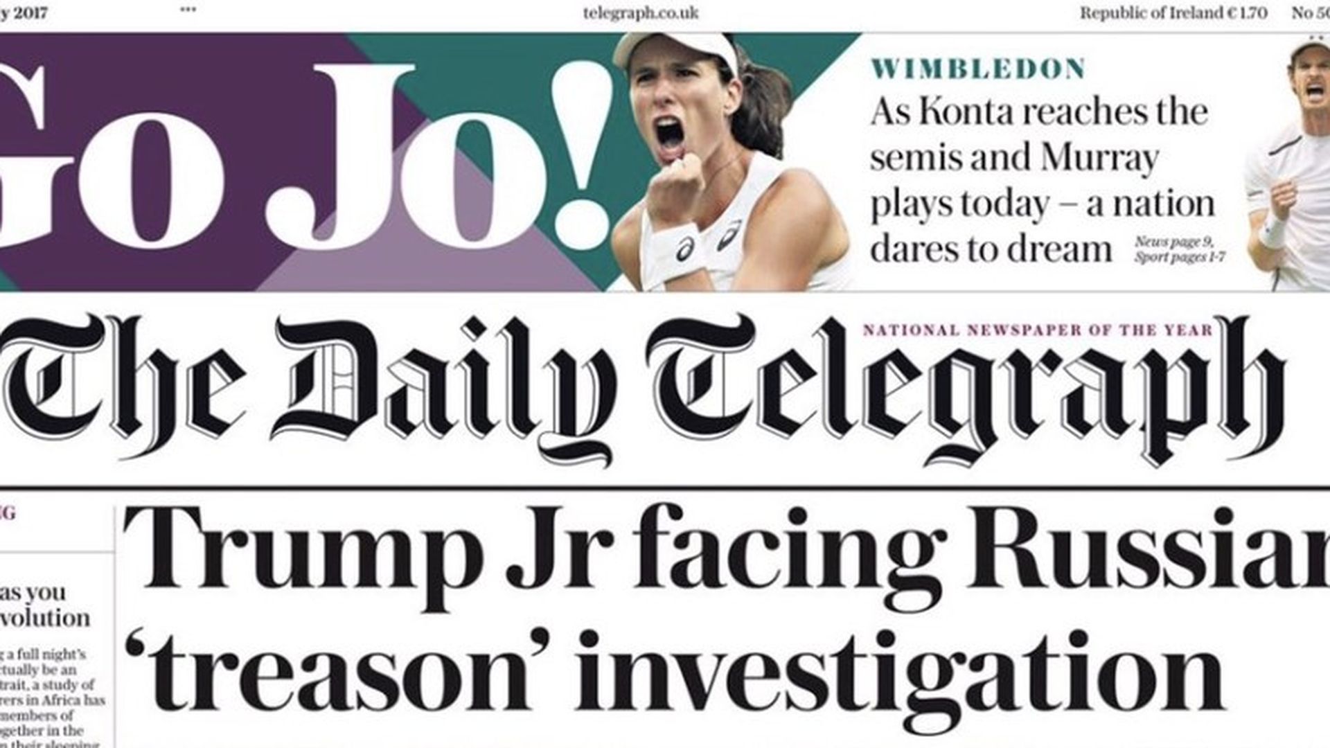 - WashPost A1, "A staff under 'Category 5' siege," by Phil Rucker and Ashley Parker: "The mind-set of Trump Jr. over the past few days has evolved from distress to anger to defiance, according to people close to him."