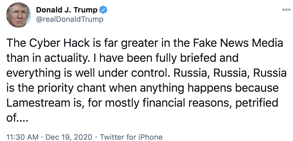 On top of loose Oval Office talk about martial law first reported by the N.Y. Times' Maggie Haberman and Zolan Kanno-Youngs, Trump tweeted yesterday that the cyberhack "is well under control."