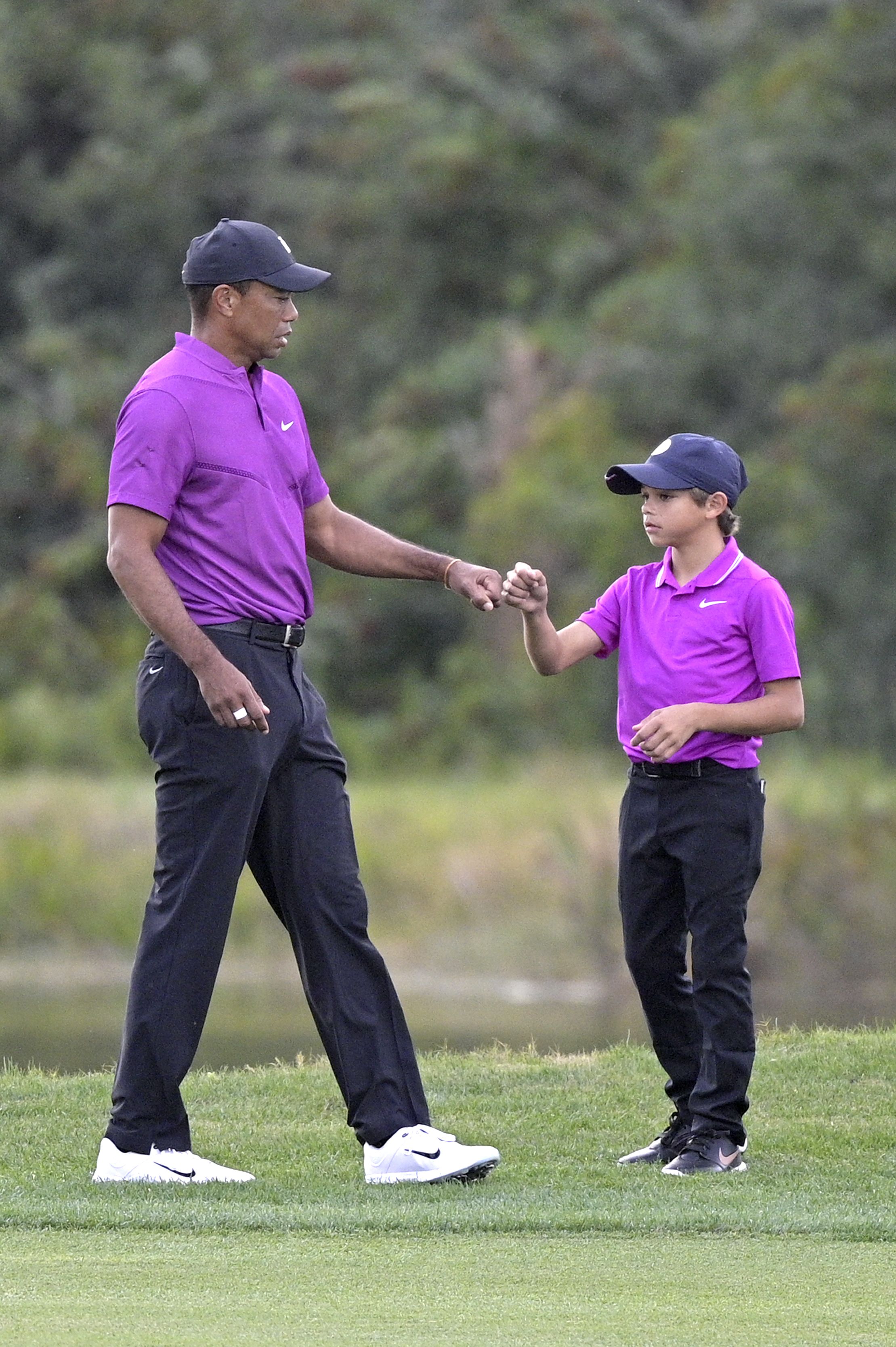 Tiger Woods, 44, and his son Charlie, 11, on the 14th fairway during the first round of the PNC Championship golf tournament in Orlando yesterday.